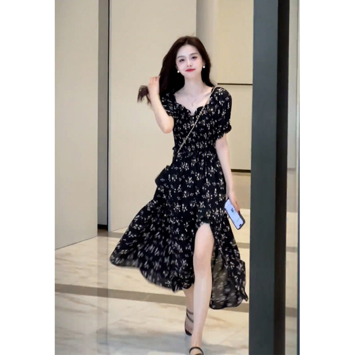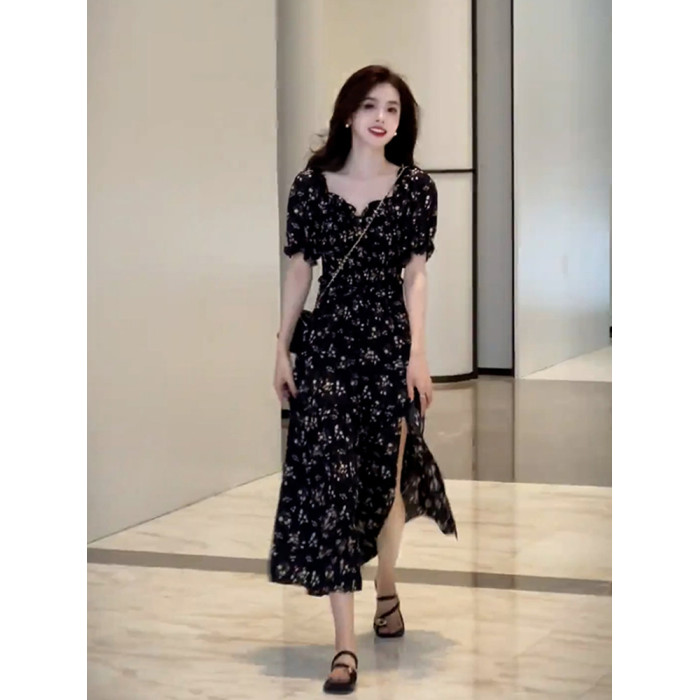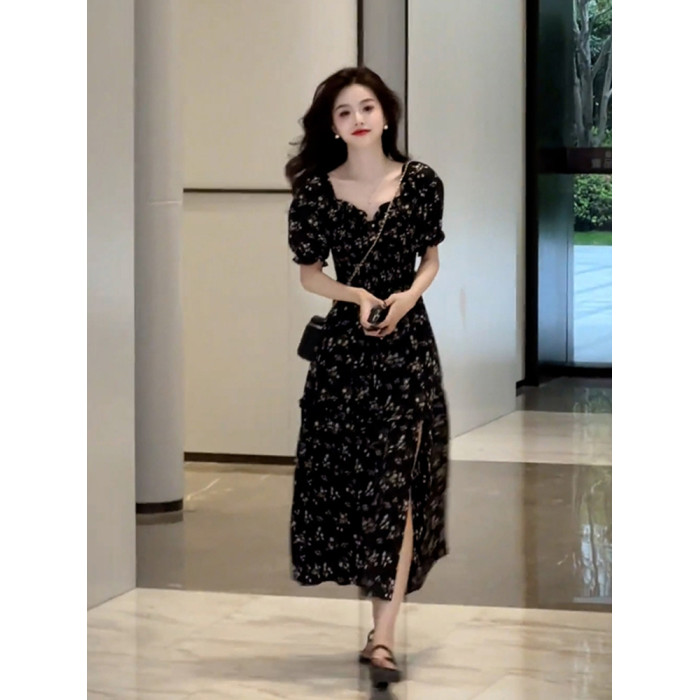 2025夏季新款法式赫本風小衆氣質收腰顯瘦長裙黑色碎花連衣裙女