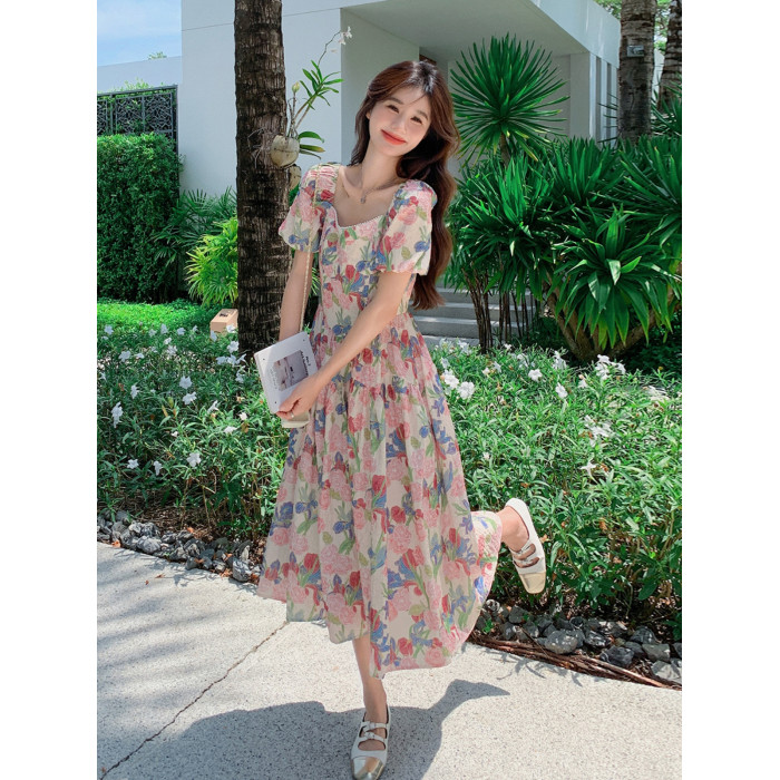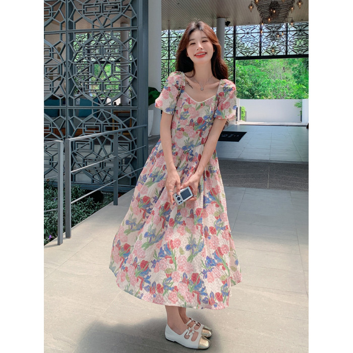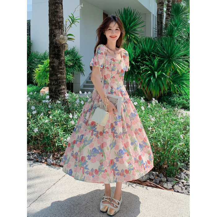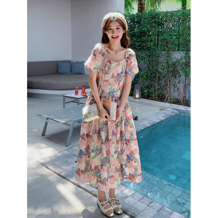 法式甜美碎花連衣裙女長款2025夏新款顯瘦小個子甜美泡泡袖a字裙