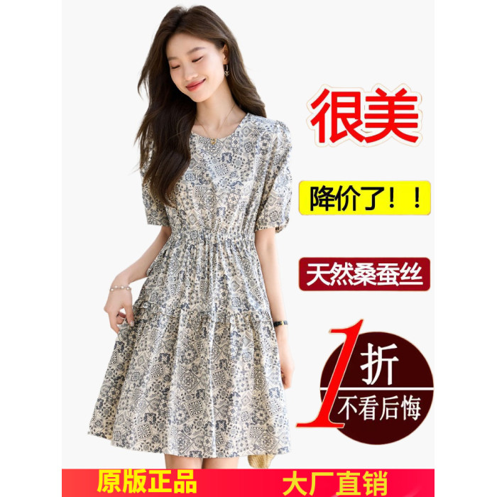 夏季真絲連衣裙女短袖2025新款國際大牌小個子收腰遮肚桑蠶絲裙子
