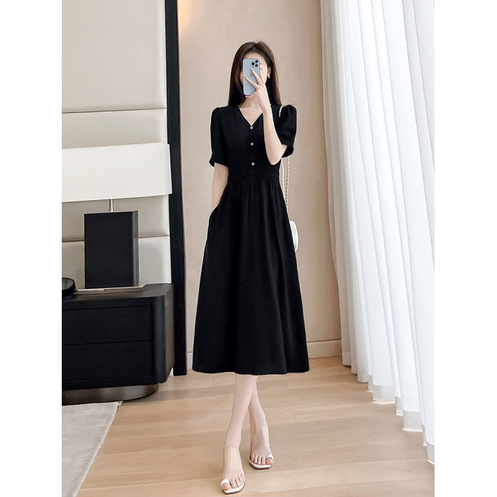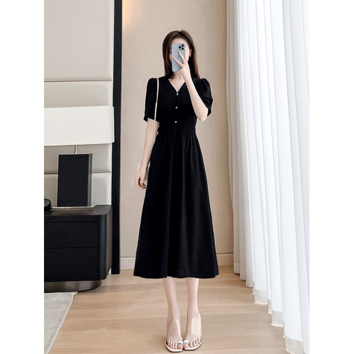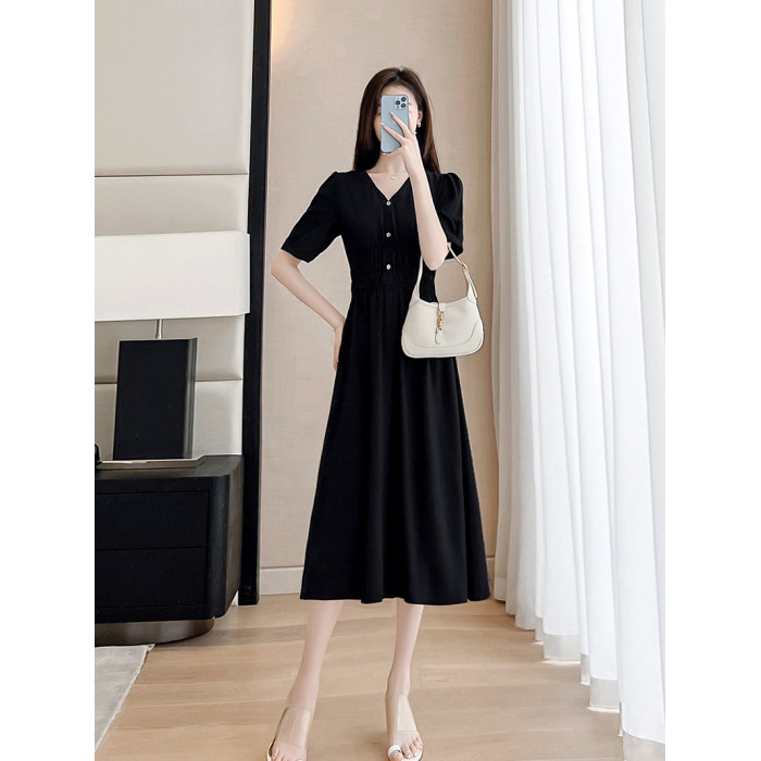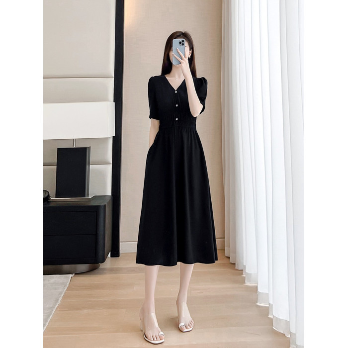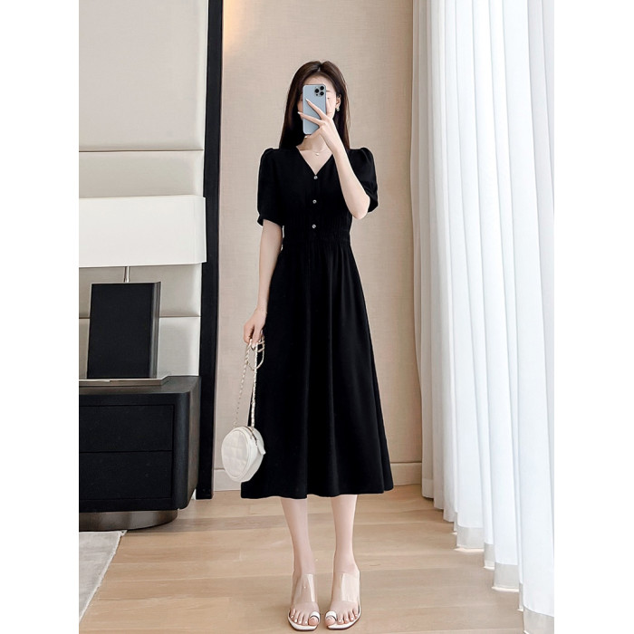 黑色短袖V領雪紡連衣裙女2025夏季新款顯瘦高級感小黑裙a字裙子女