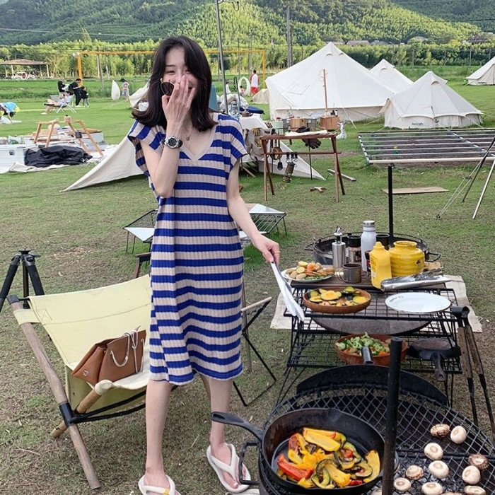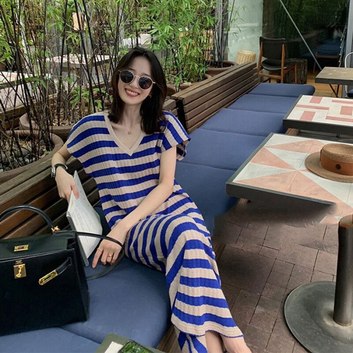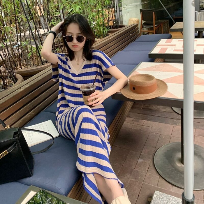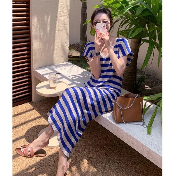 歐洲站2025夏新款韓系度假藍色條紋炸街高級感薄款針織v領連衣裙