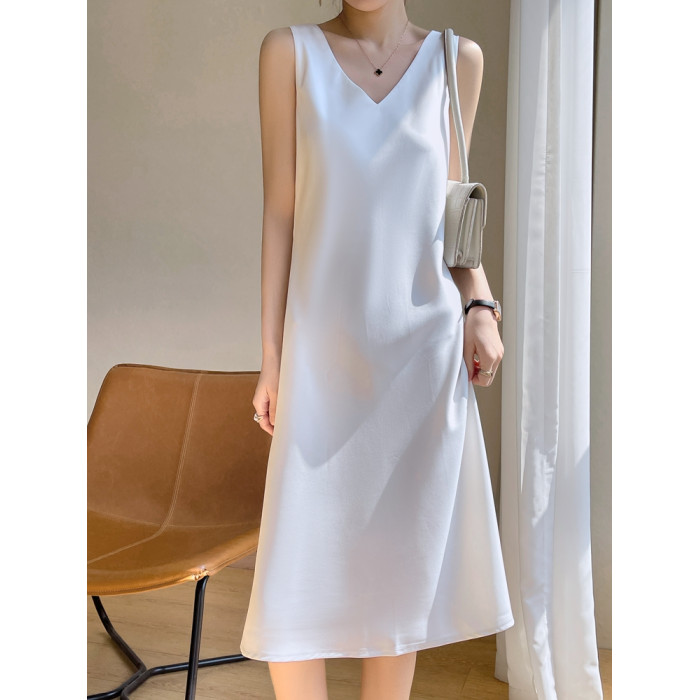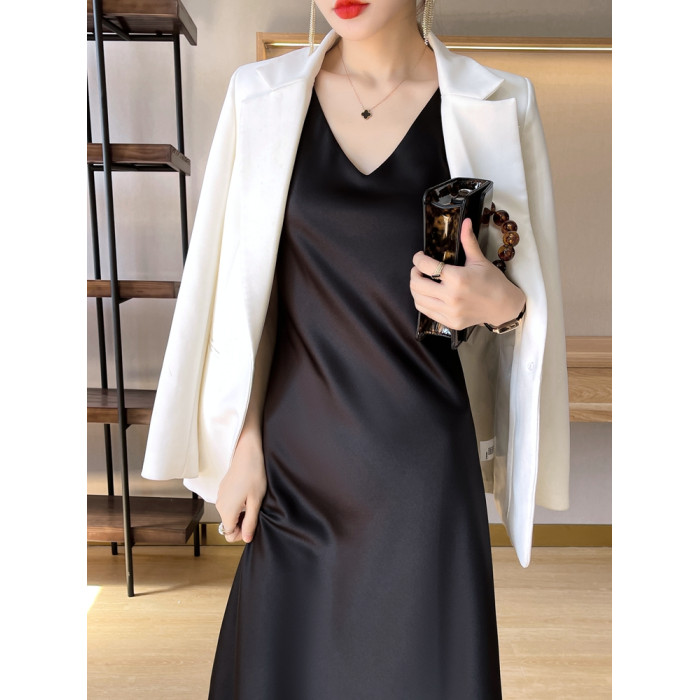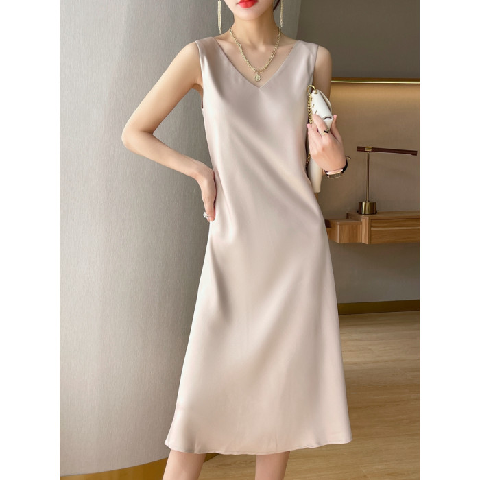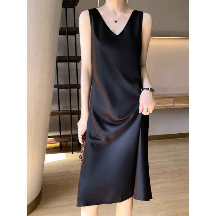 醋酸緞面V領吊帶連衣裙女高級感春夏無袖純色冰絲背心長裙小黑裙