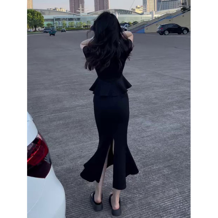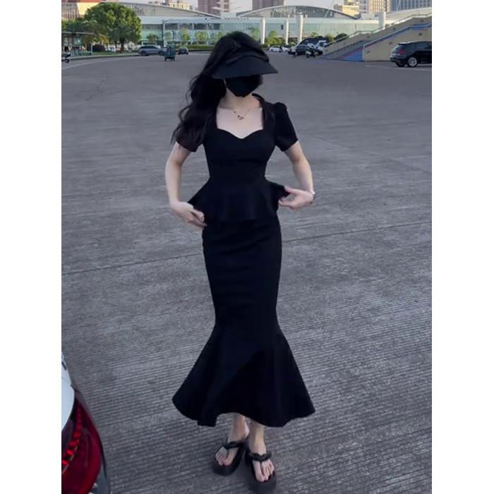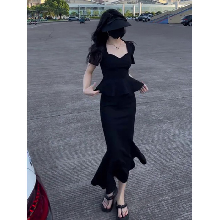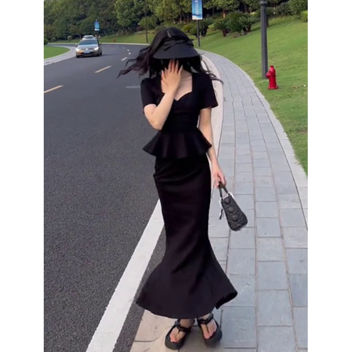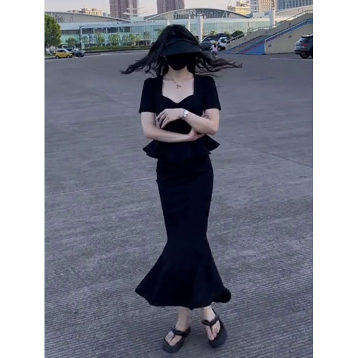 2025夏季新款法式復古赫本風連衣裙修身顯瘦魚尾半身裙兩件套裝女