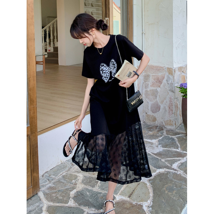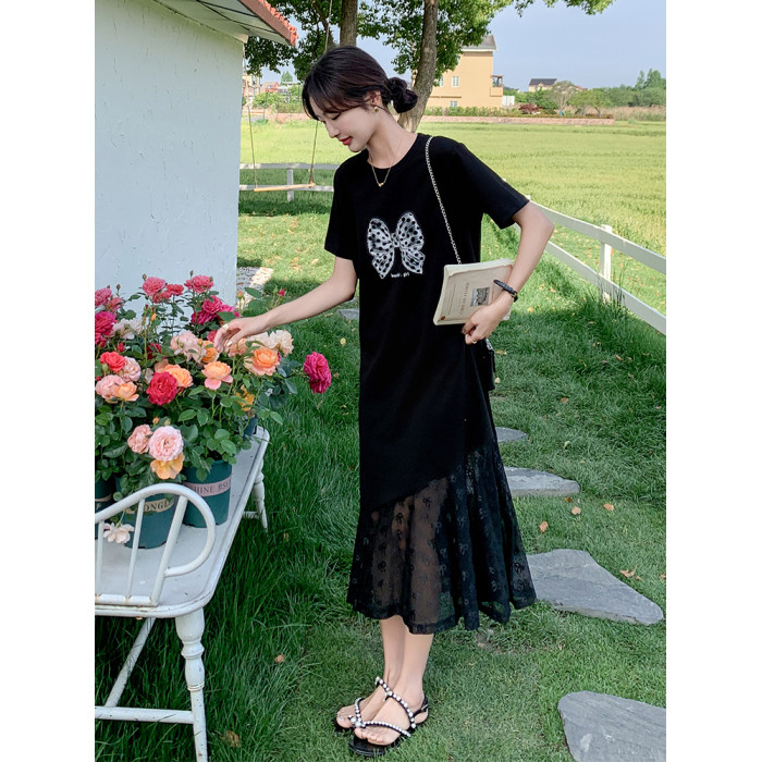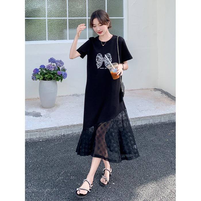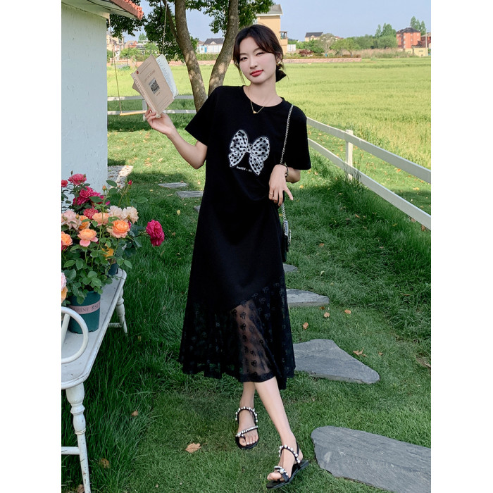 黑色大碼連衣裙女夏寬松胖mm顯瘦遮肚藏肉減齡拼接長款T恤魚尾裙