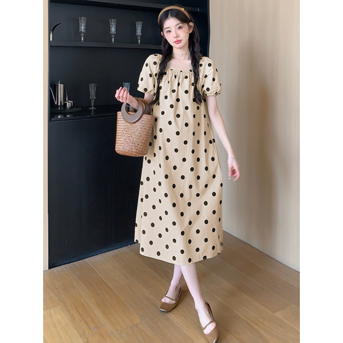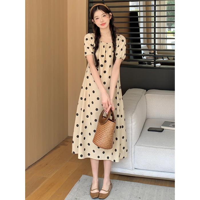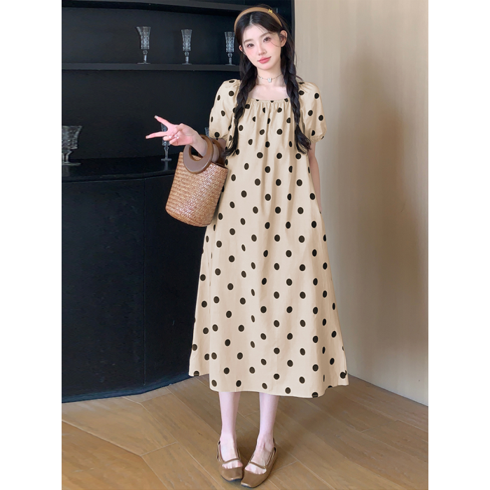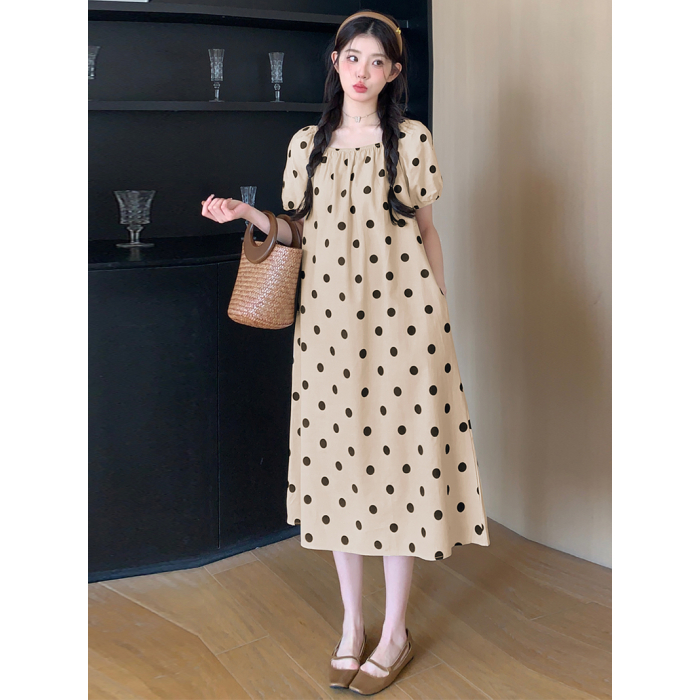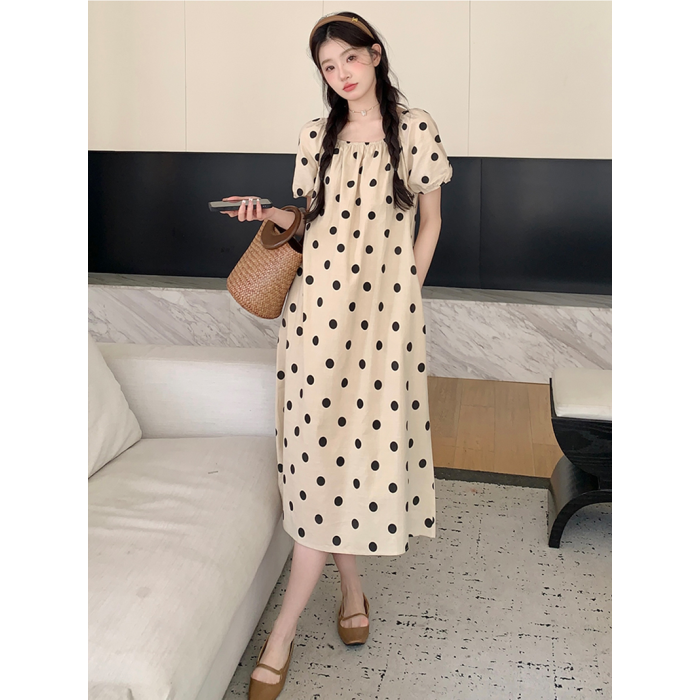 韓版短袖棉麻波點連衣裙女夏2025新款小個子寬松遮肚氣質顯瘦長裙