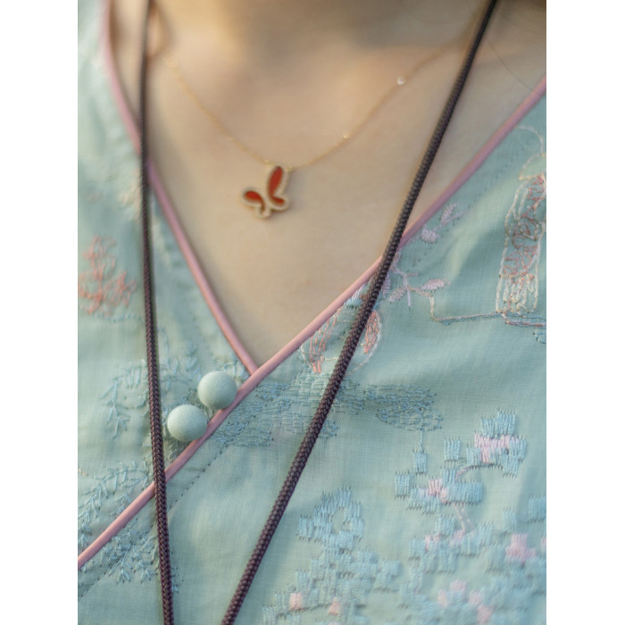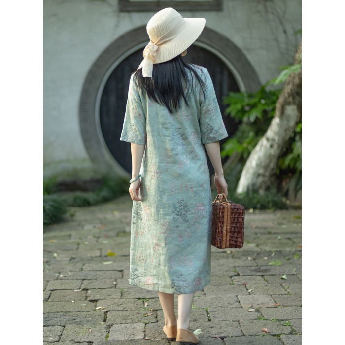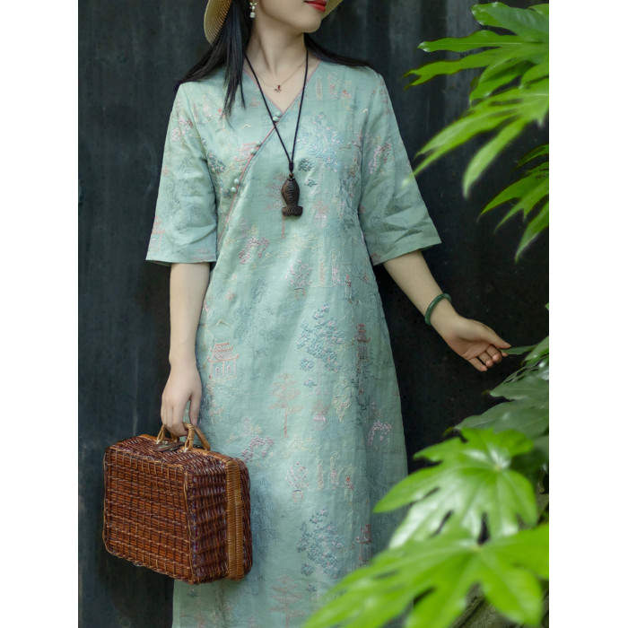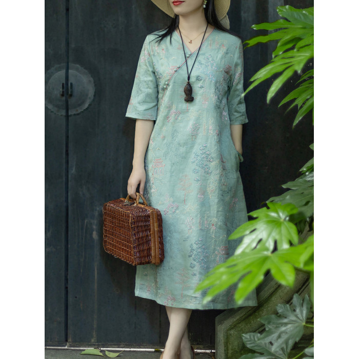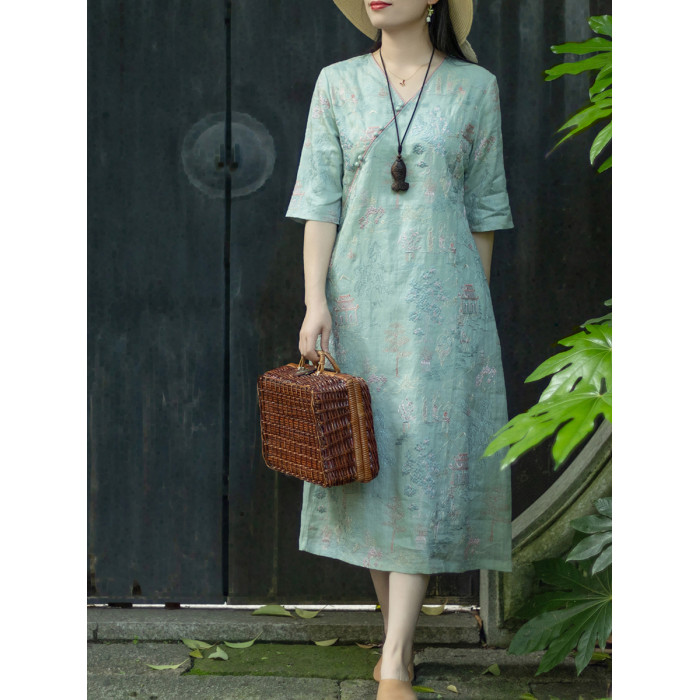 念江南重工氣質V領苧麻刺綉小衆設計連衣裙女新中式改良旗袍裙子