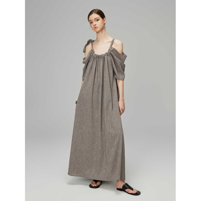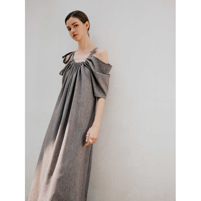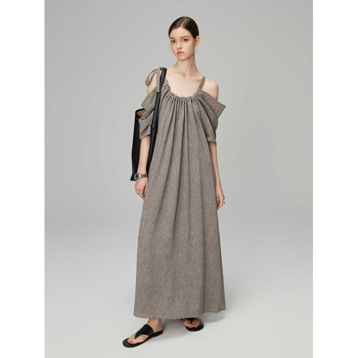LINNAE慵懶度假風超好看吊帶露肩褶皺設計亞麻法式連衣裙女夏