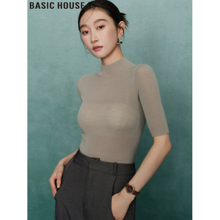 Basic House/百家好半高領中袖針織打底衫修身內搭上衣女秋季新款