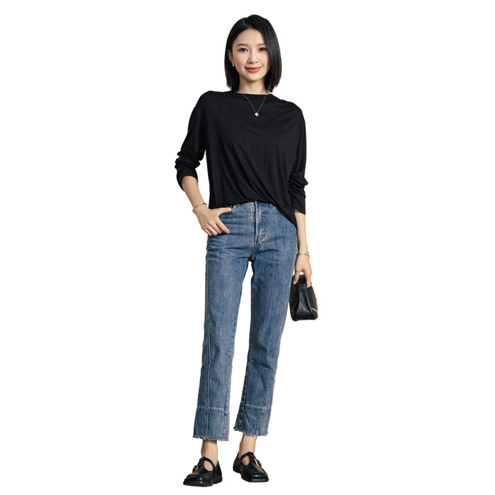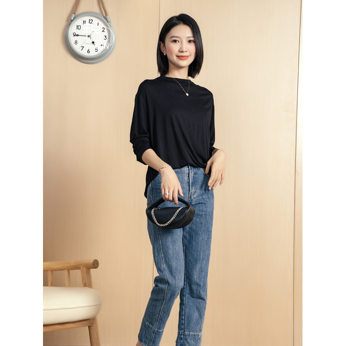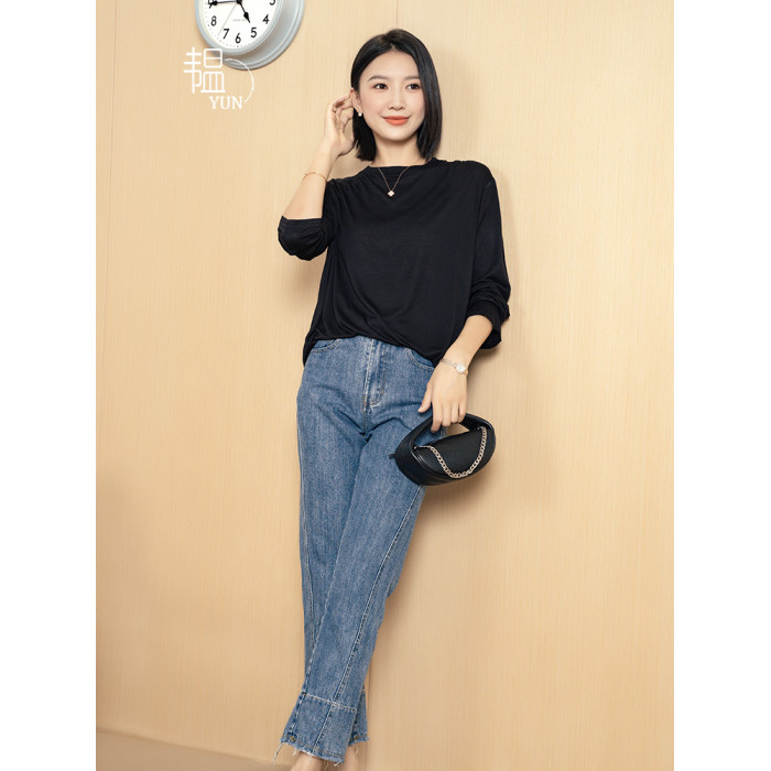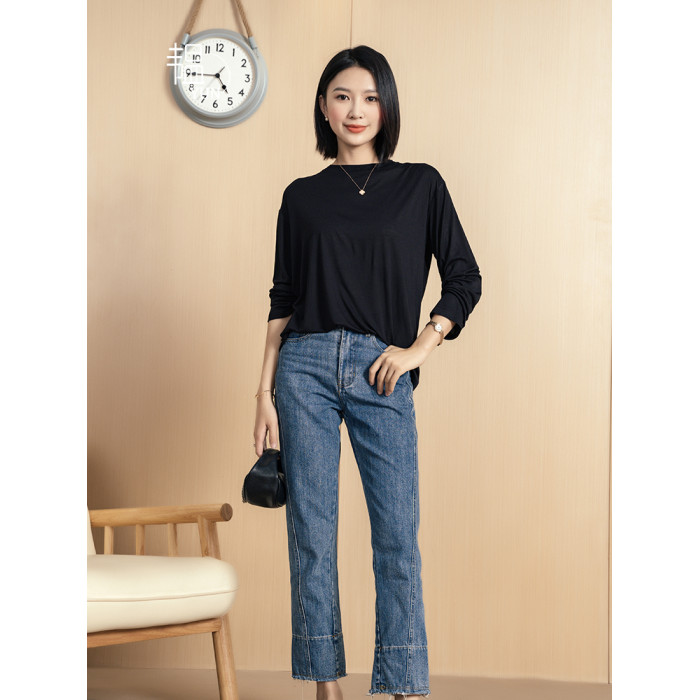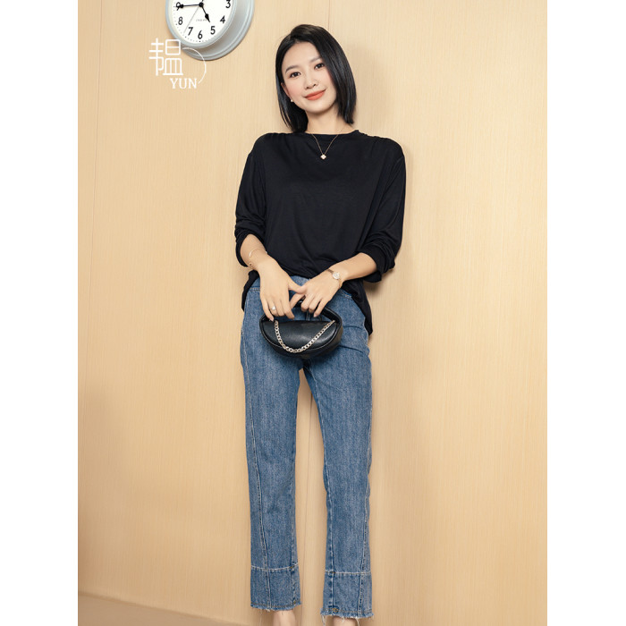 【YUN】韞2024秋季新款女莫代爾純黑顯瘦百搭休閒打底衫長袖上衣