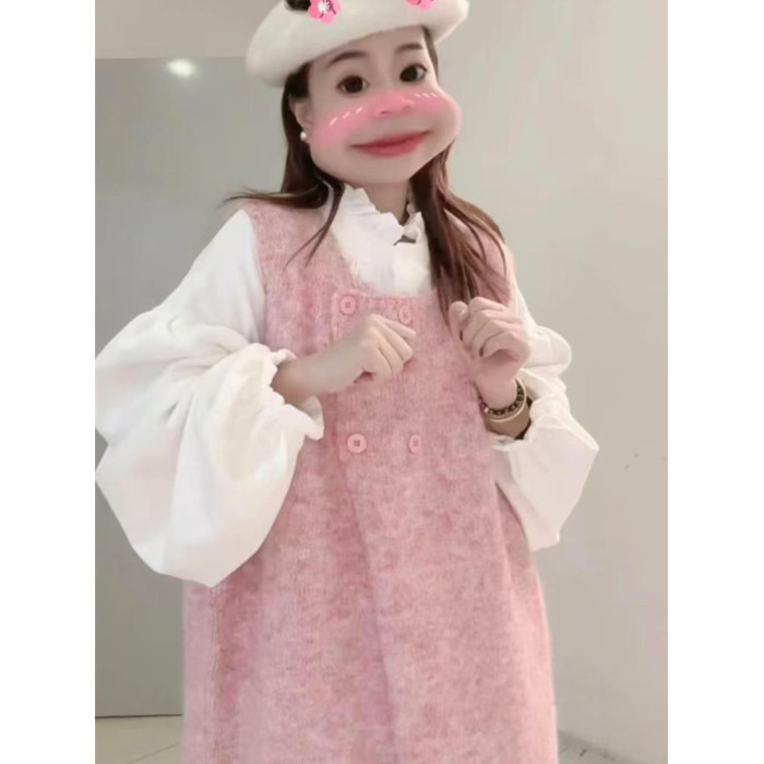 大碼胖mm遮肉顯瘦粉色馬甲長裙女秋冬季針織背心寬松打底衫過膝裙