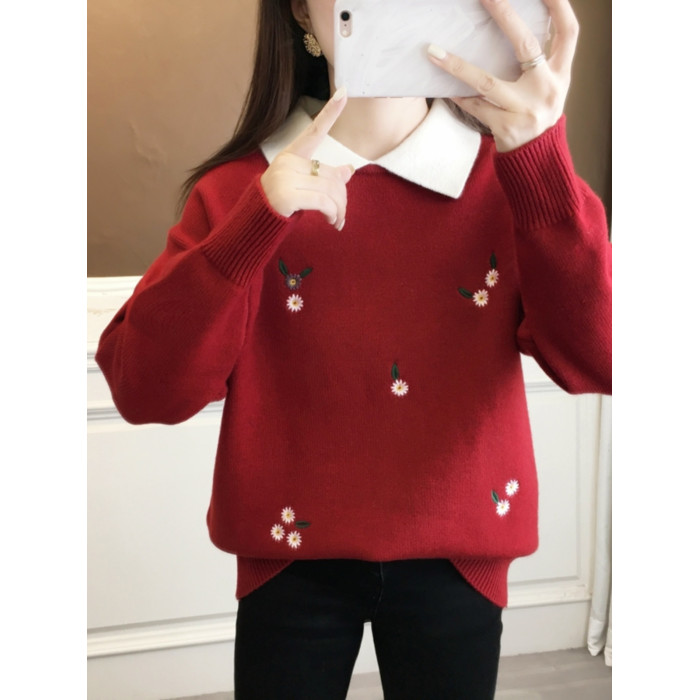 紅色假兩件毛衣女裝秋冬季高中初中學生大童本命年針織打底衫上衣