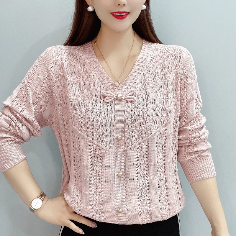 春秋裝薄款純色棉線針織衫女長袖上衣V領套頭外搭韓版寬松打底衫