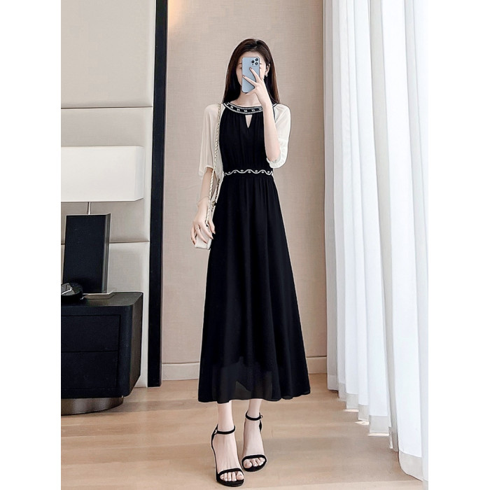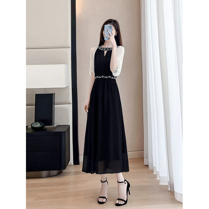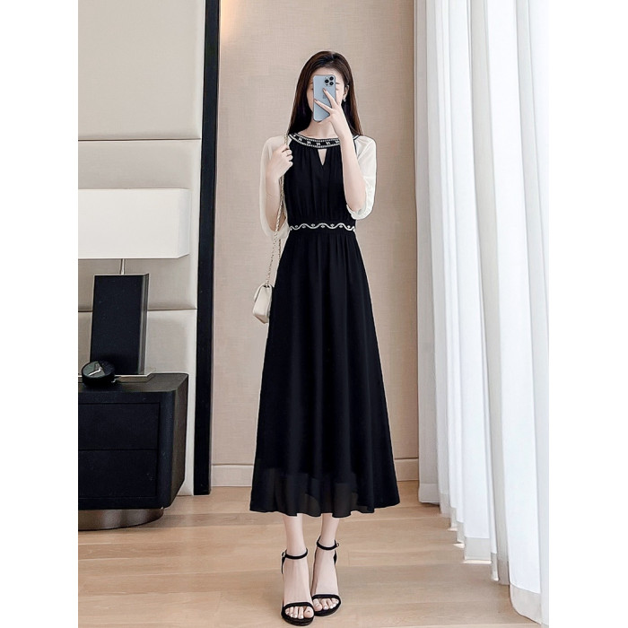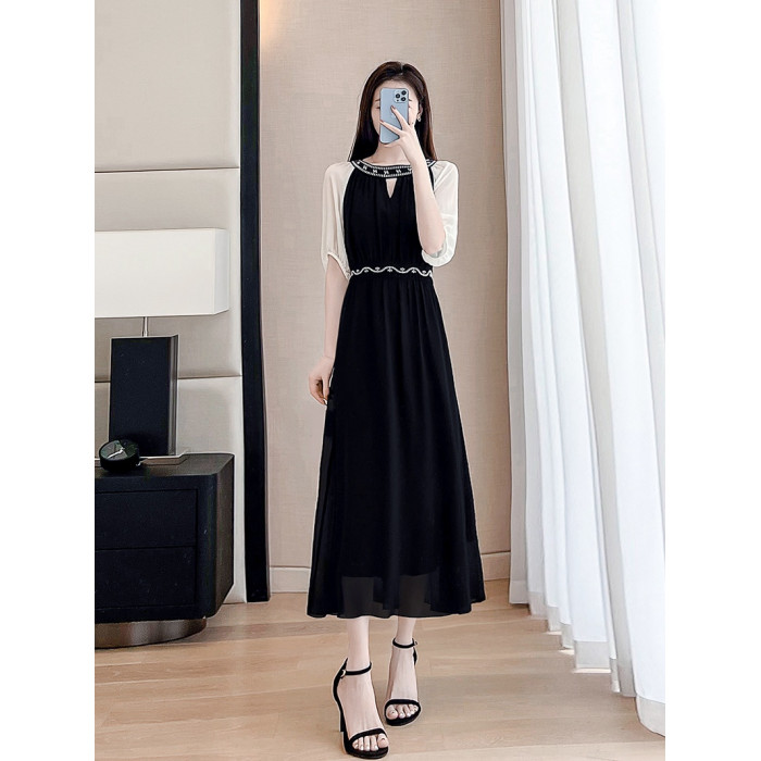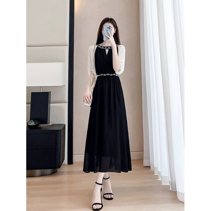 黑色法式優雅中袖雪紡連衣裙2025新款夏季收腰顯瘦氣質a字裙子女