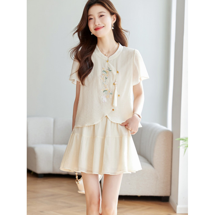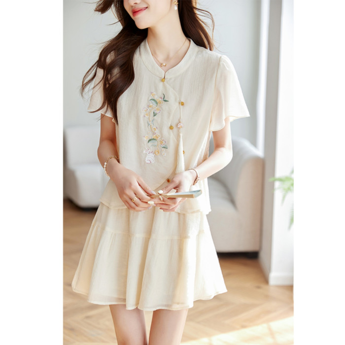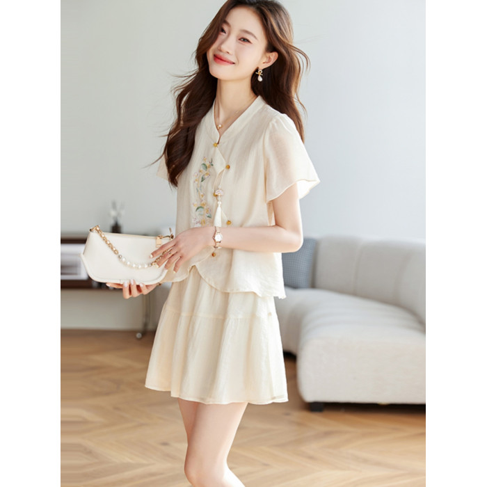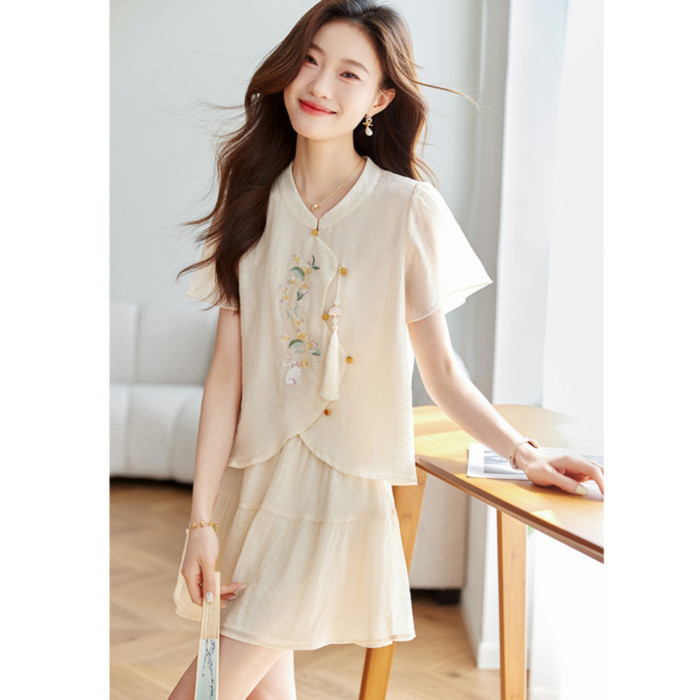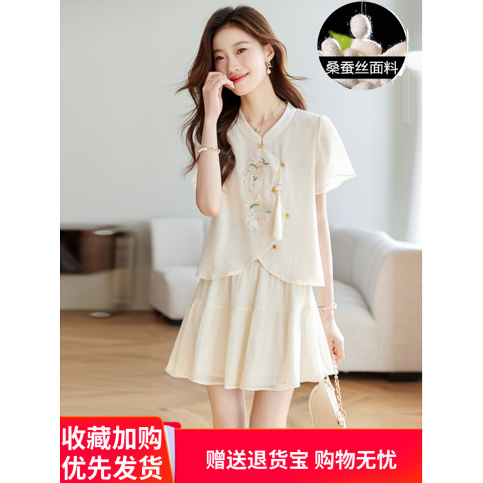 杭州新中式兩件套真絲連衣裙女夏新款小個子洋氣質短袖桑蠶絲裙子