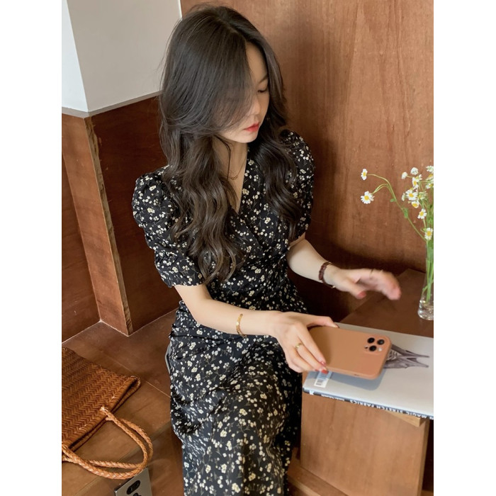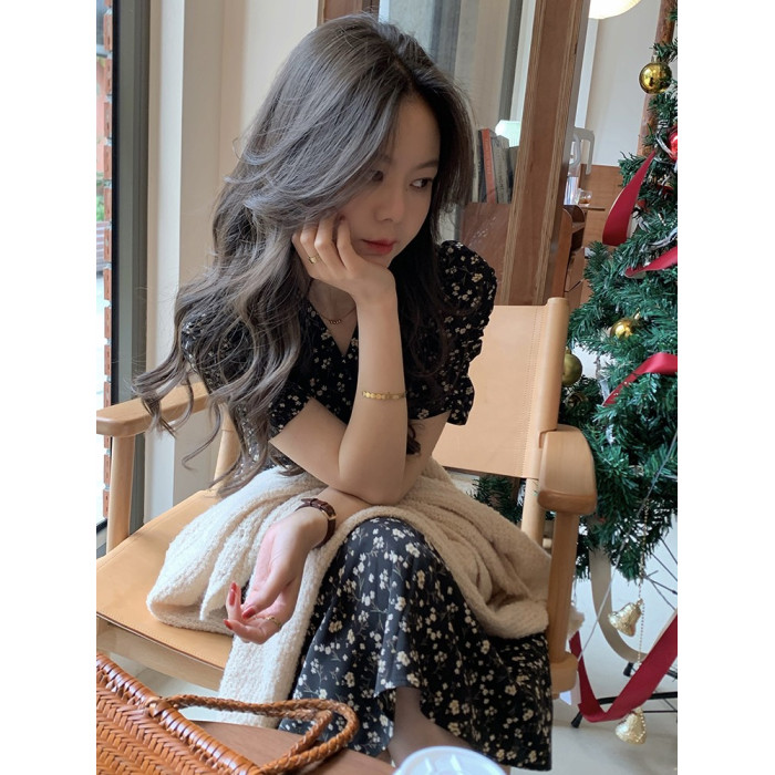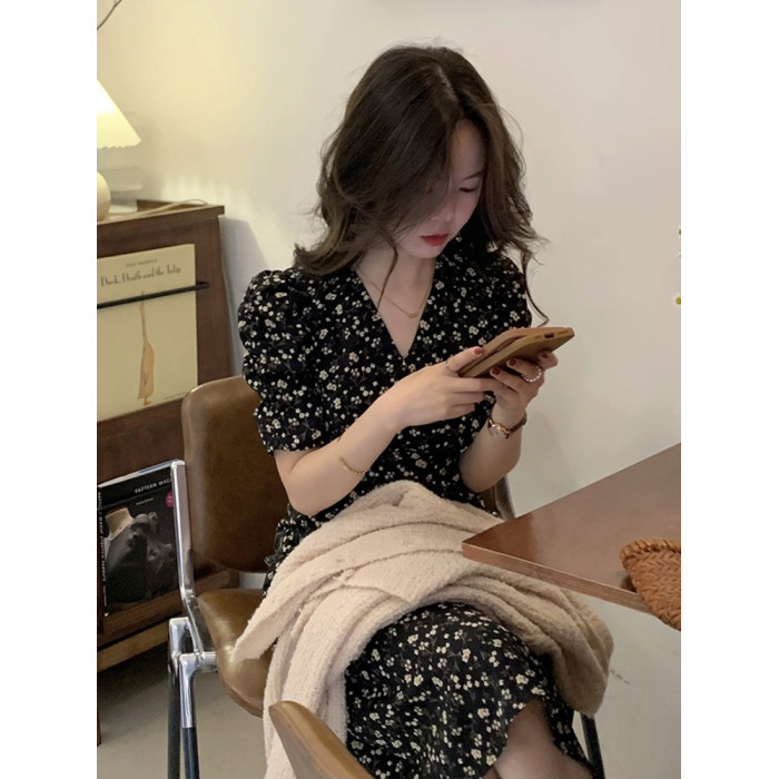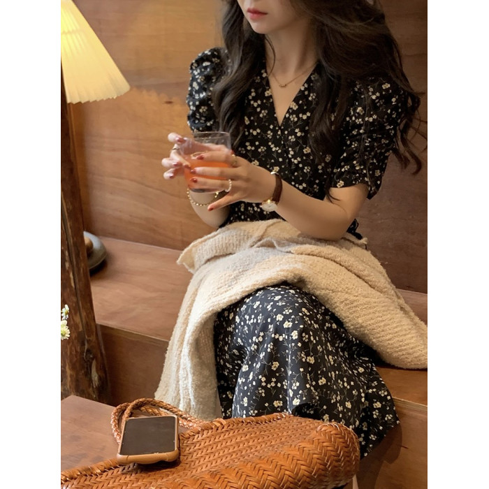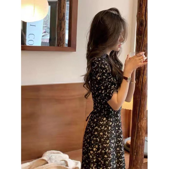 夏季2025新款山本風法式黑色碎花連衣裙女高級感小衆復古系帶長裙