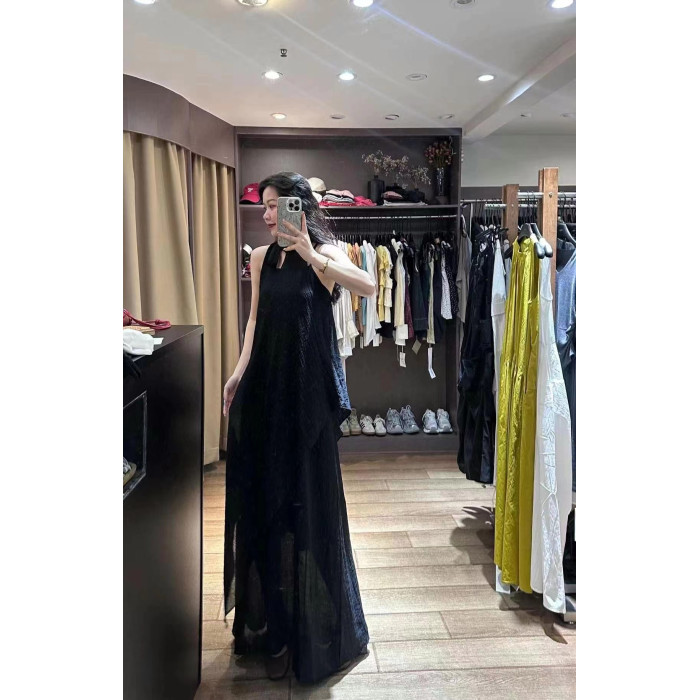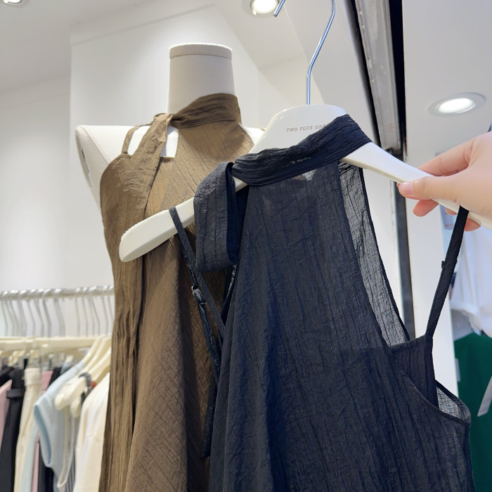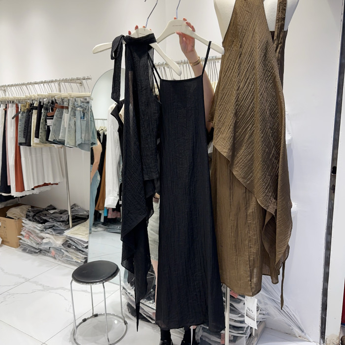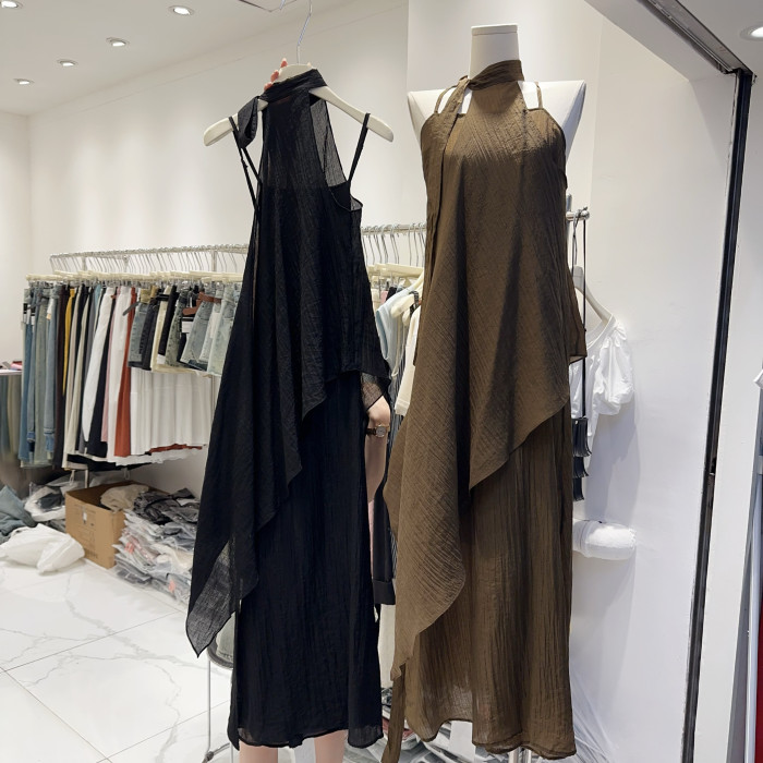 度假風連衣裙韓版時尚性感掛脖露肩不規則設計感網紗連衣裙兩件套