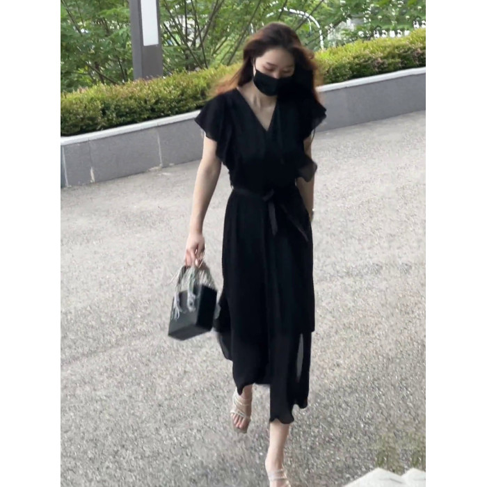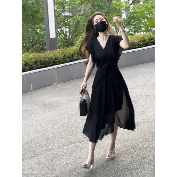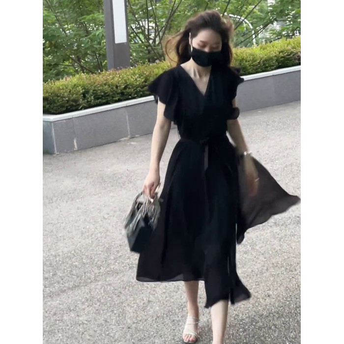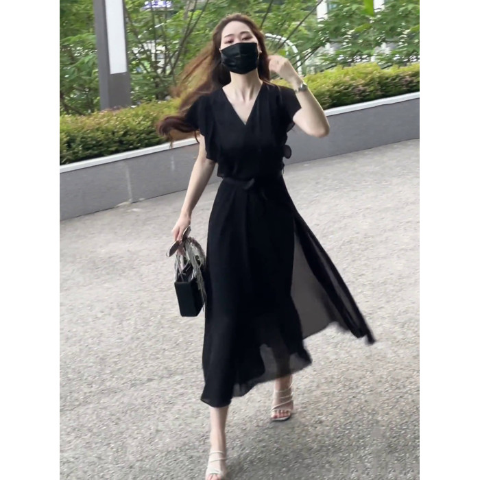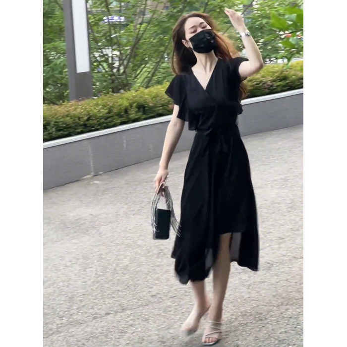黑色雪紡連衣裙女夏2025新款法式赫本風小衆設計收腰顯瘦V領長裙