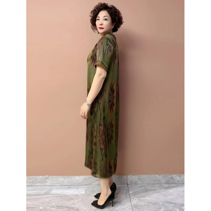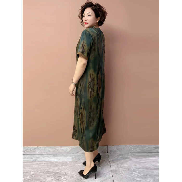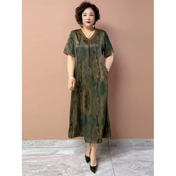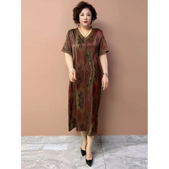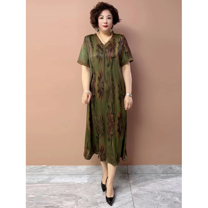 中年媽媽夏季短袖真絲連衣裙濶太太氣質減齡洋氣大碼長款過膝長裙