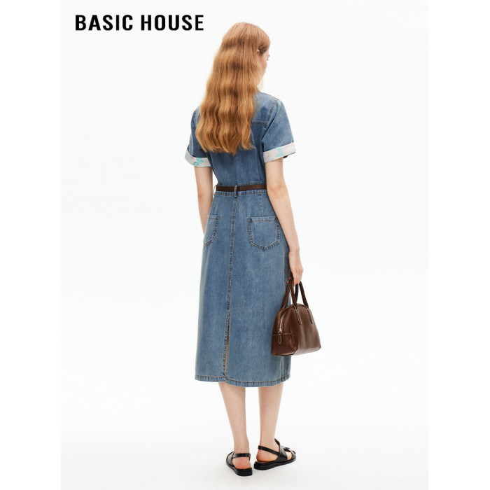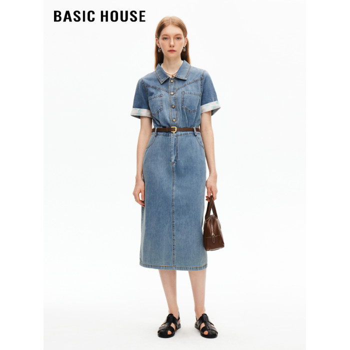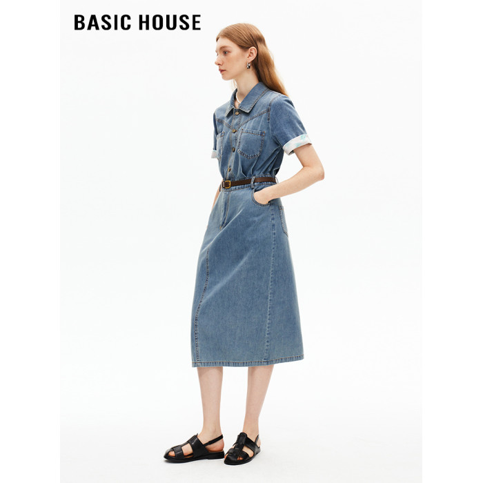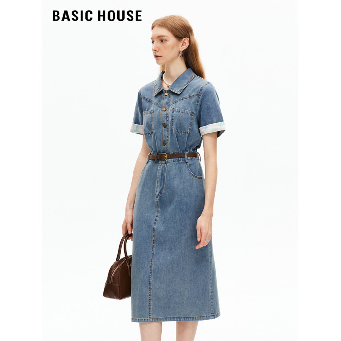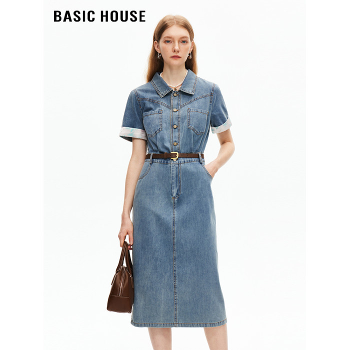 百家好/Basic House時尚翻領拼接袖口牛仔短袖連衣裙女復古長裙夏