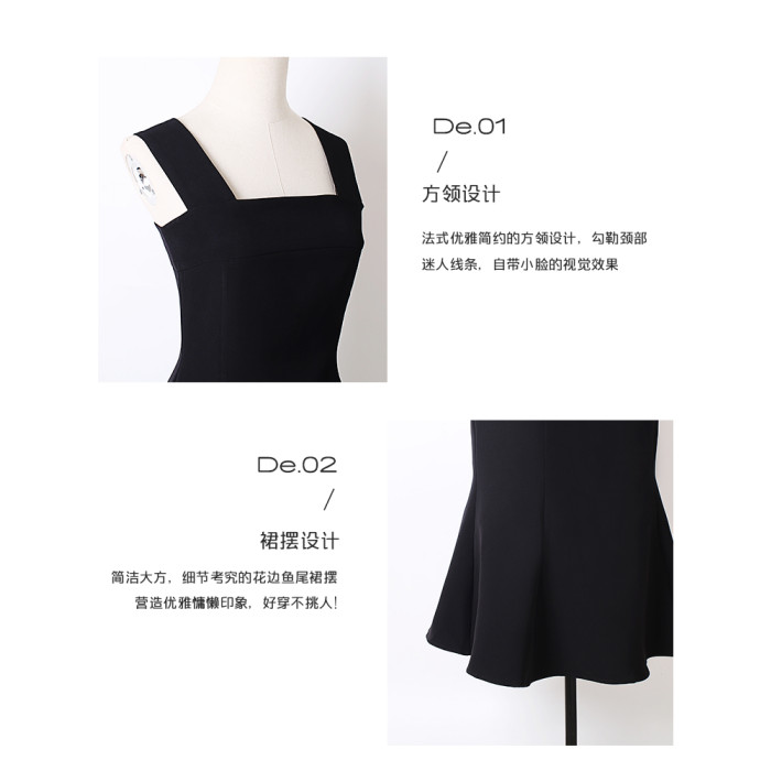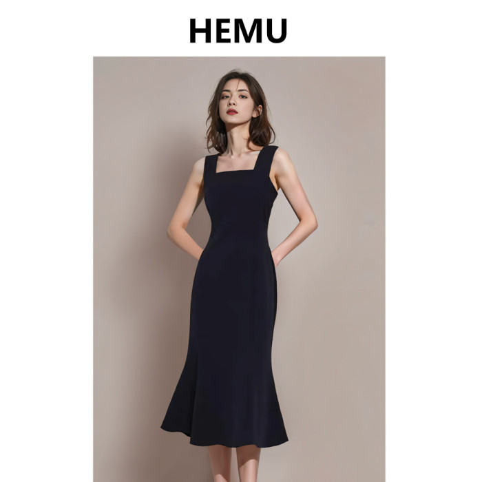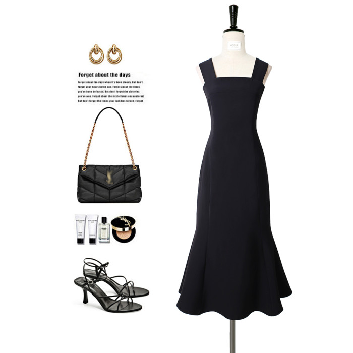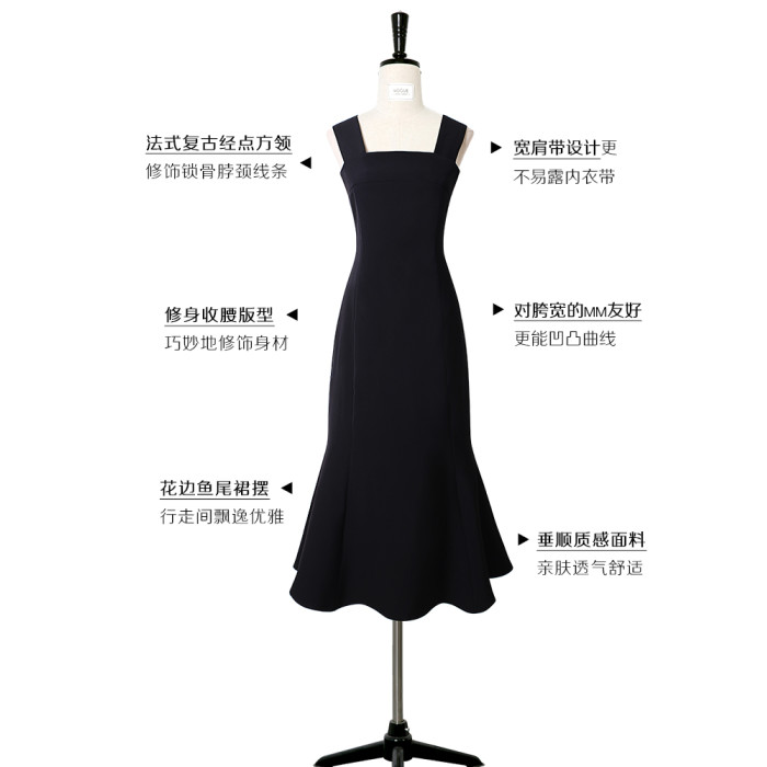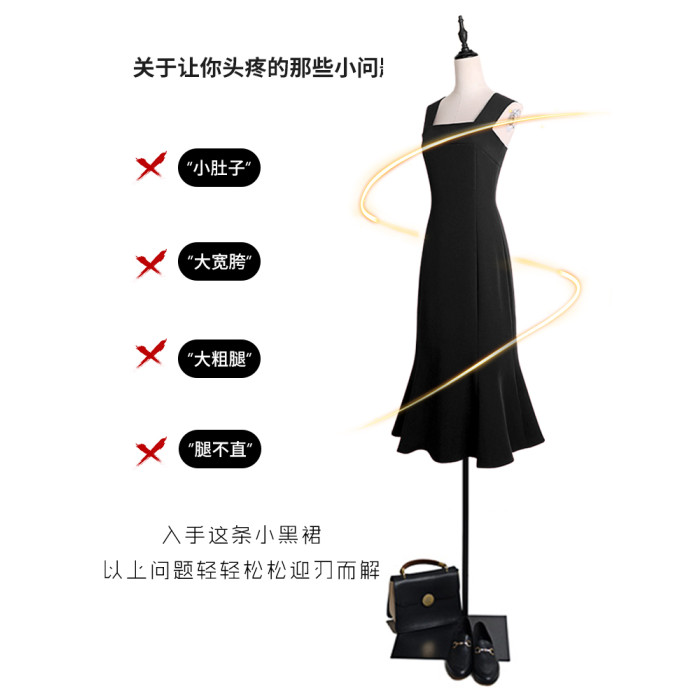 赫本風連衣裙女夏法式小衆設計高級感吊帶魚尾小黑裙禮服年會穿搭