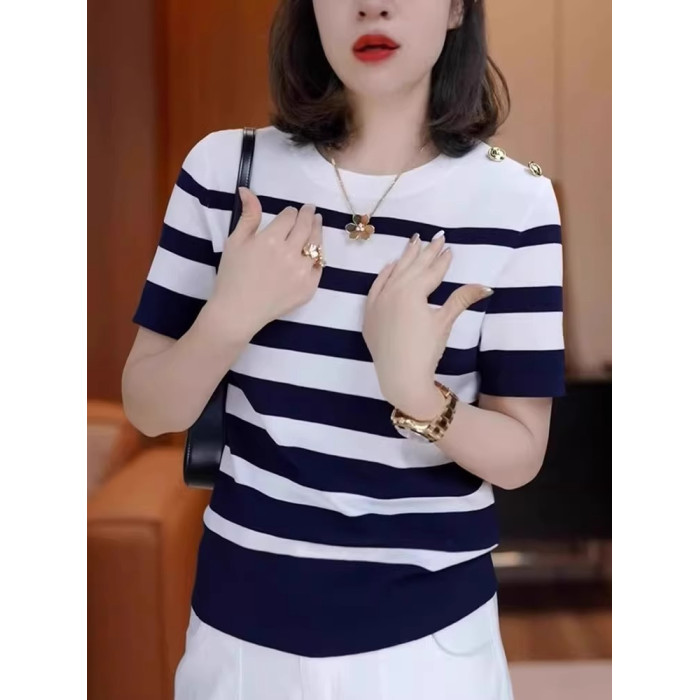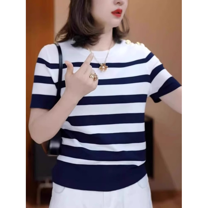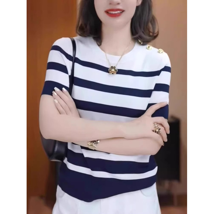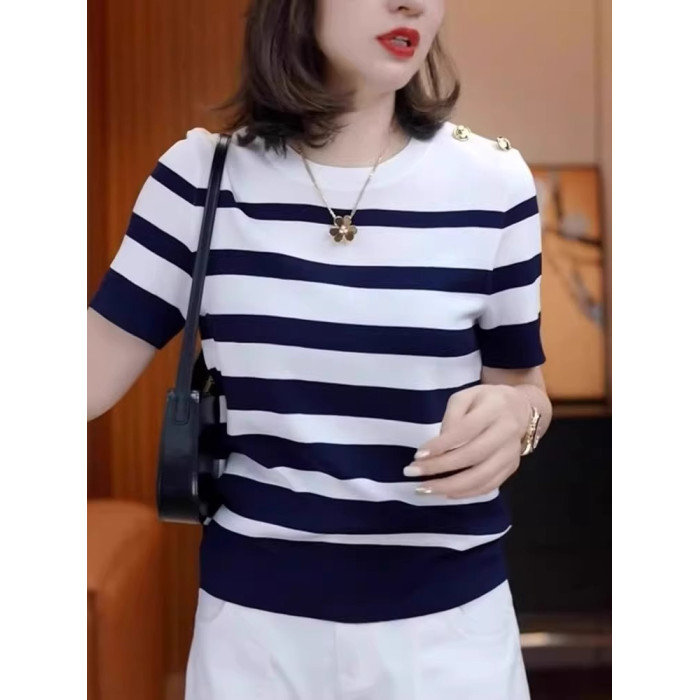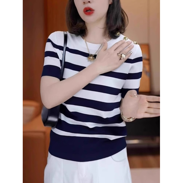 設計感撞色條紋冰絲針織衫夏季薄款顯瘦百搭打底衫舒適套頭上衣女