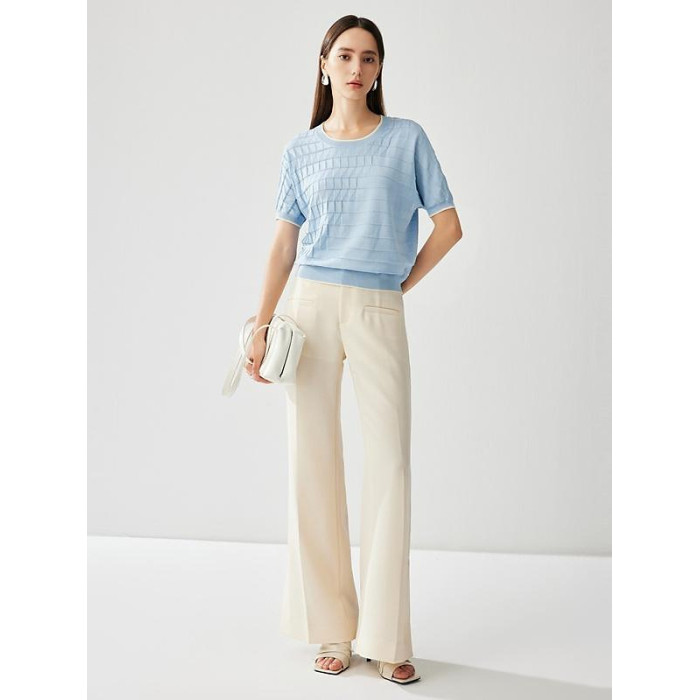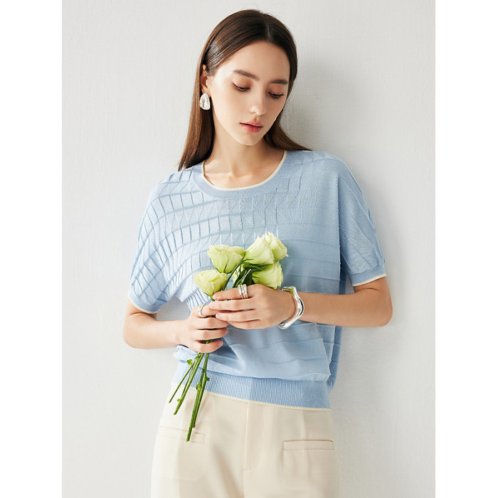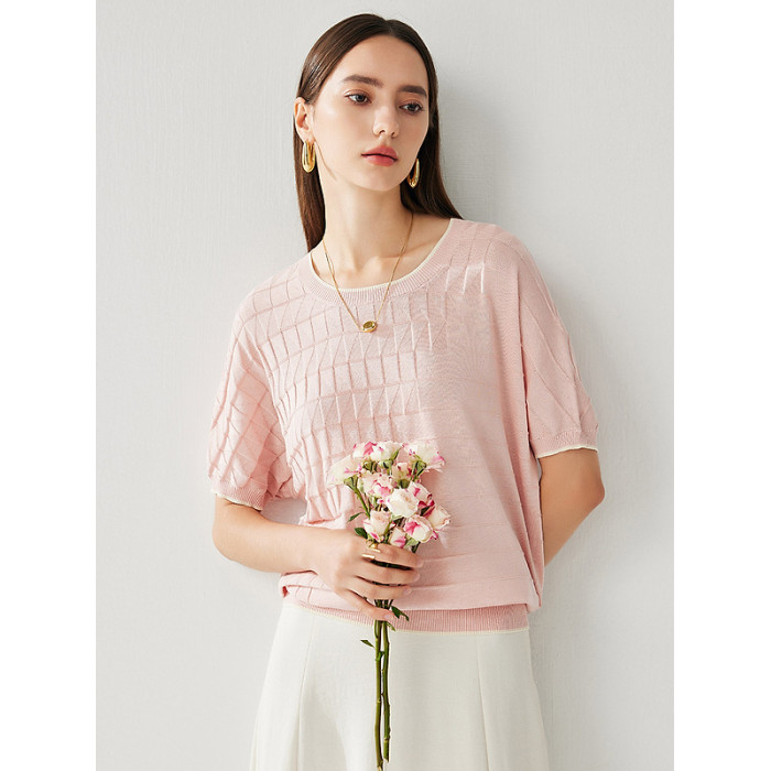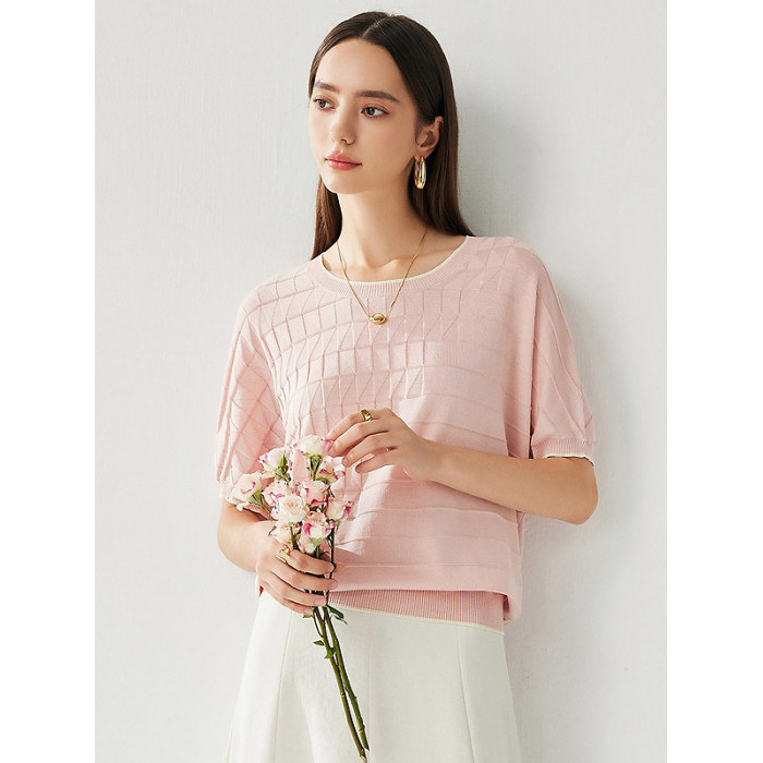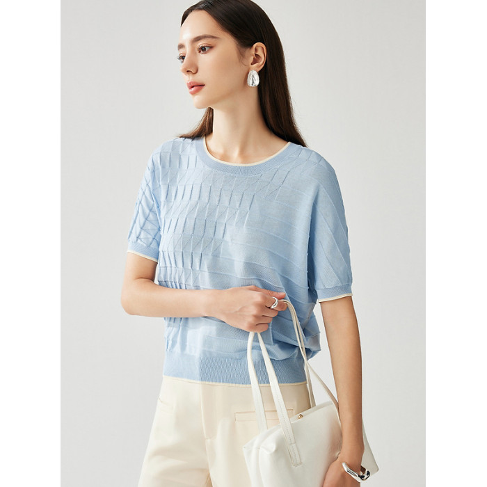兆君馬卡龍桑蠶絲短袖幾何分割圓領女25春夏針織衫寬松上衣打底衫