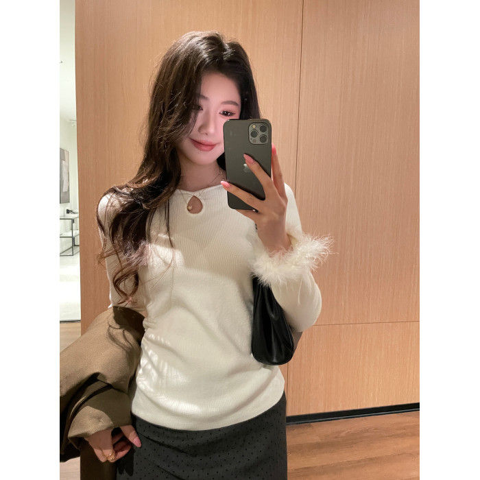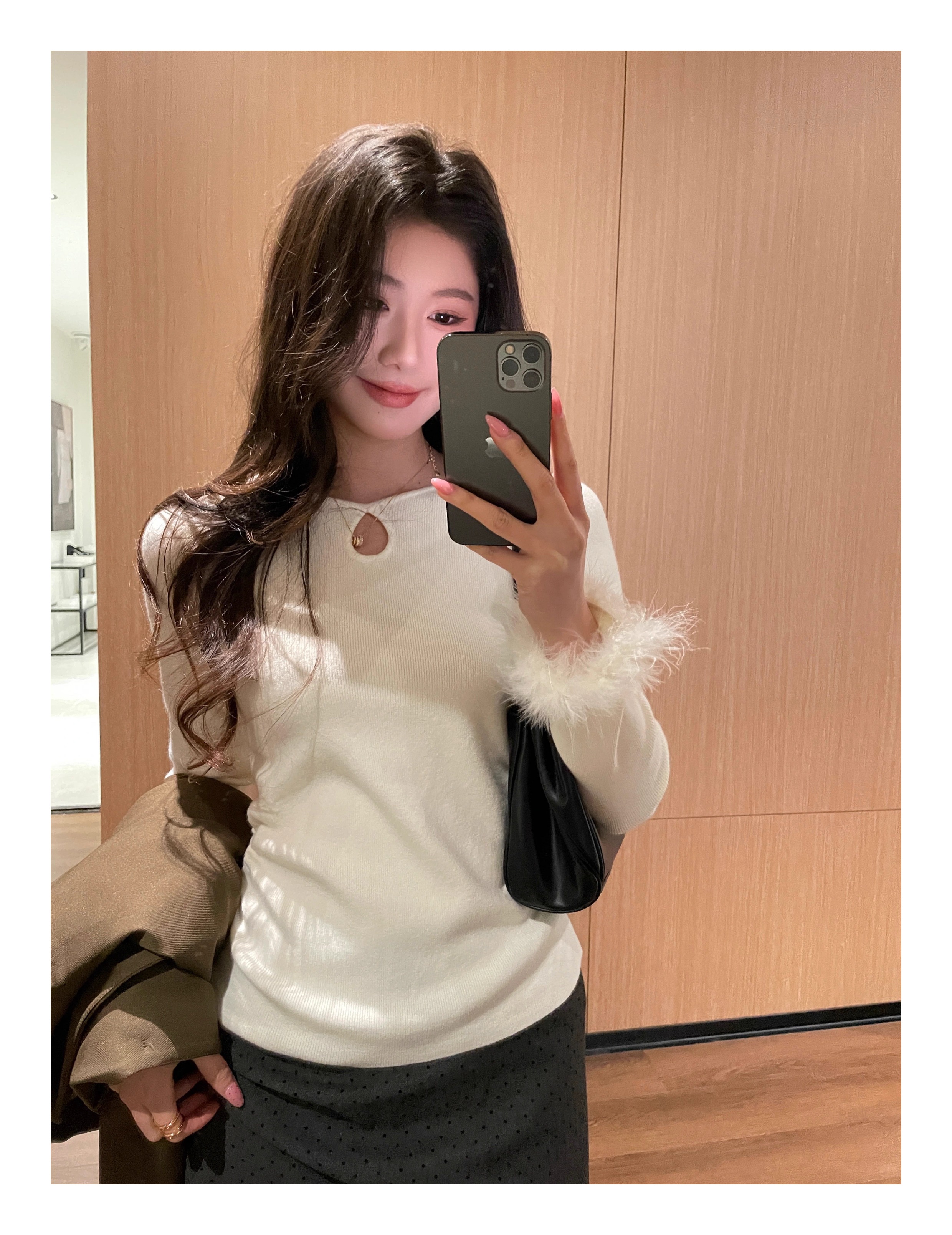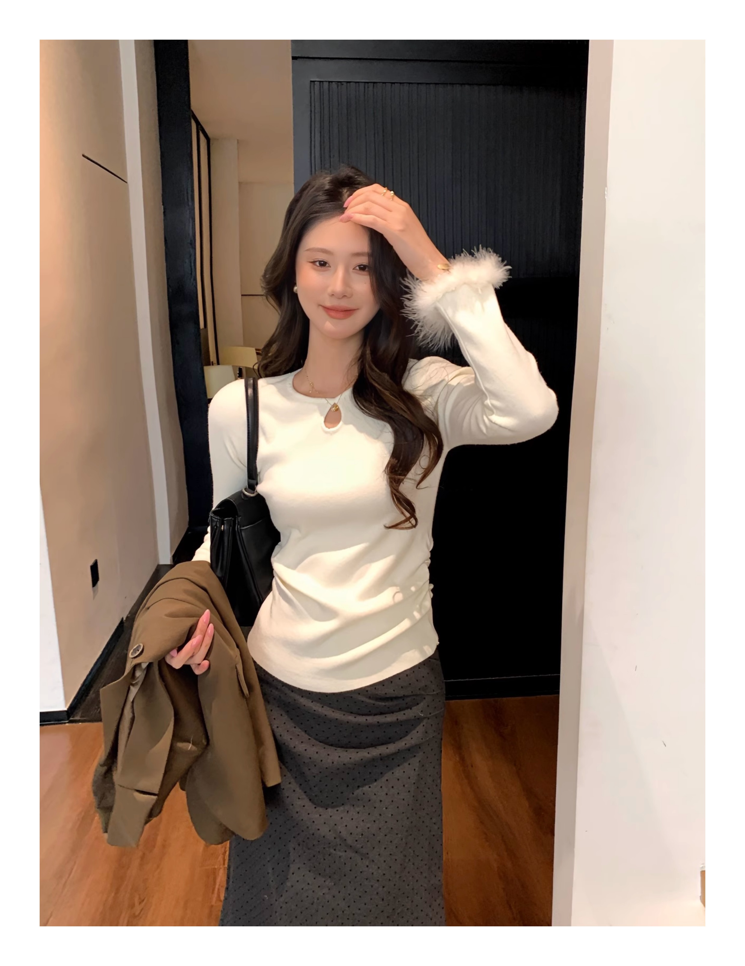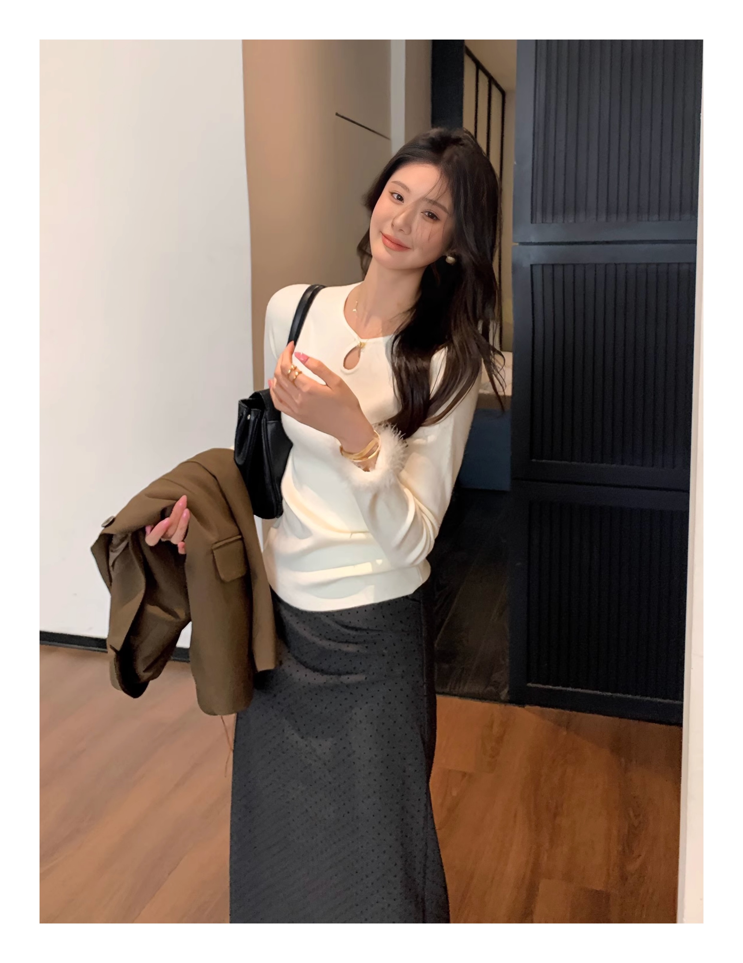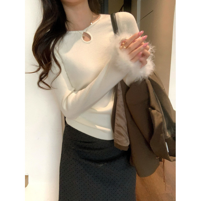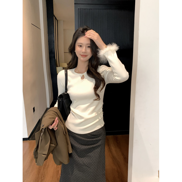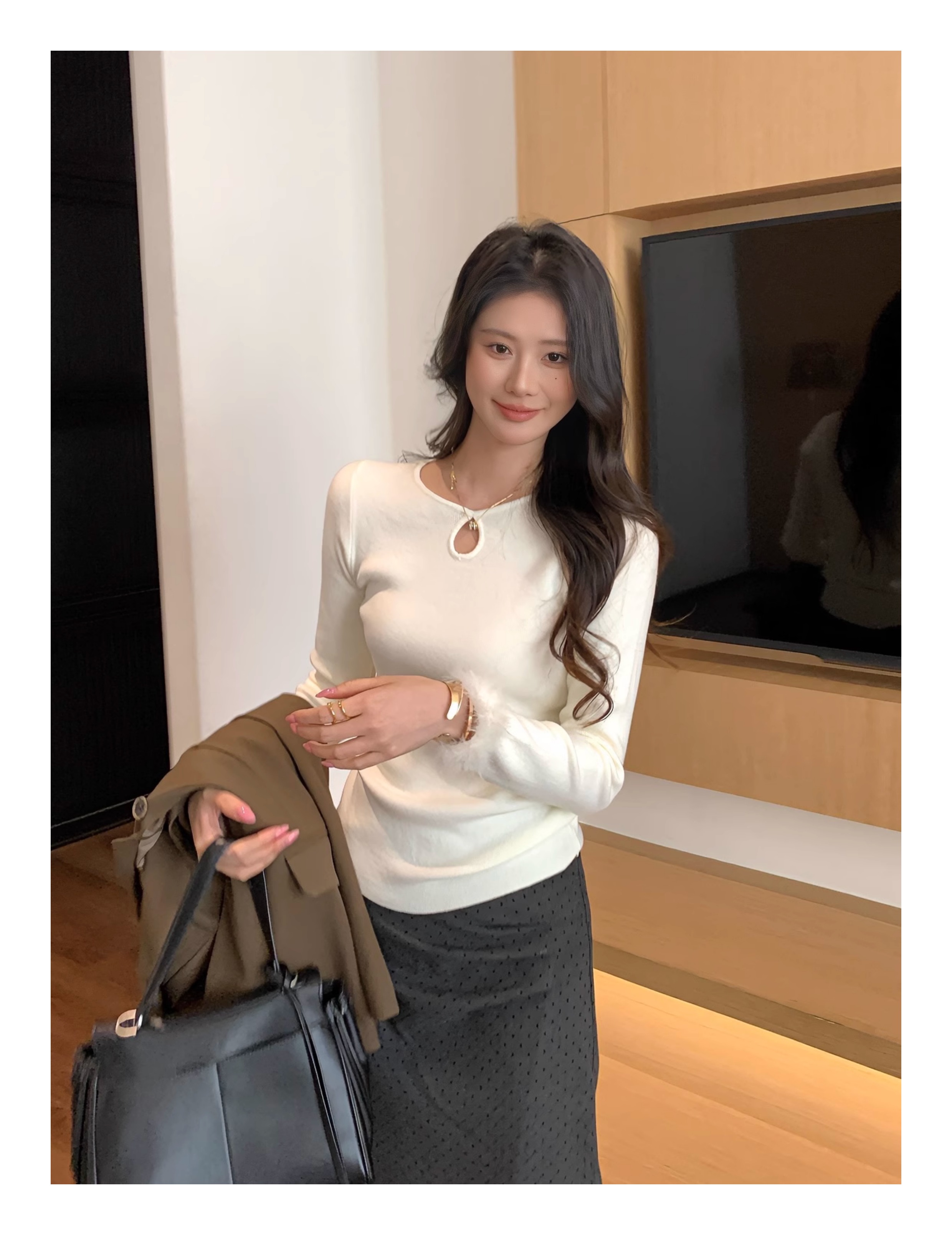 UKILAU春裝新品設計感鏤空長袖內搭上衣女修身顯瘦百搭針織打底衫
