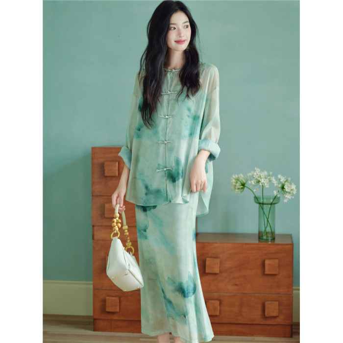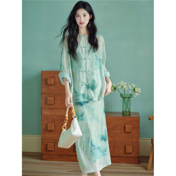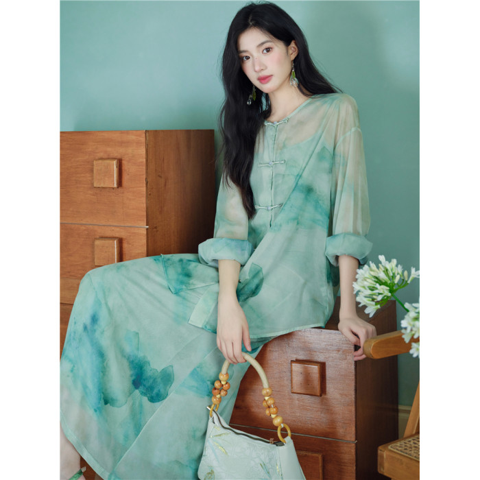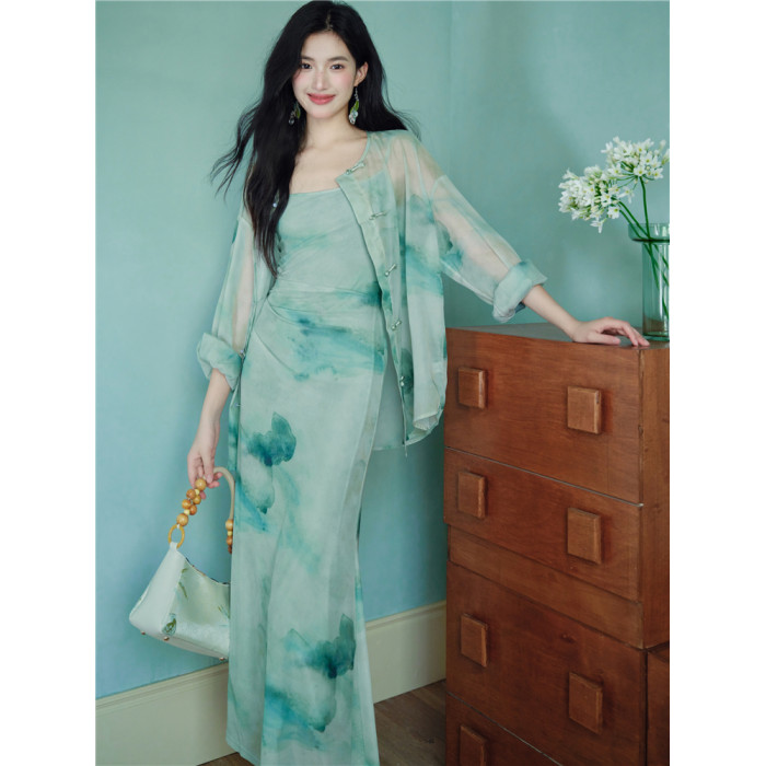 2024夏裝新中式國風禪意彿系女裝清冷感穿搭江南風旗袍連衣裙套裝
