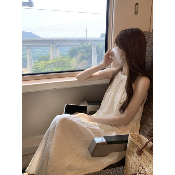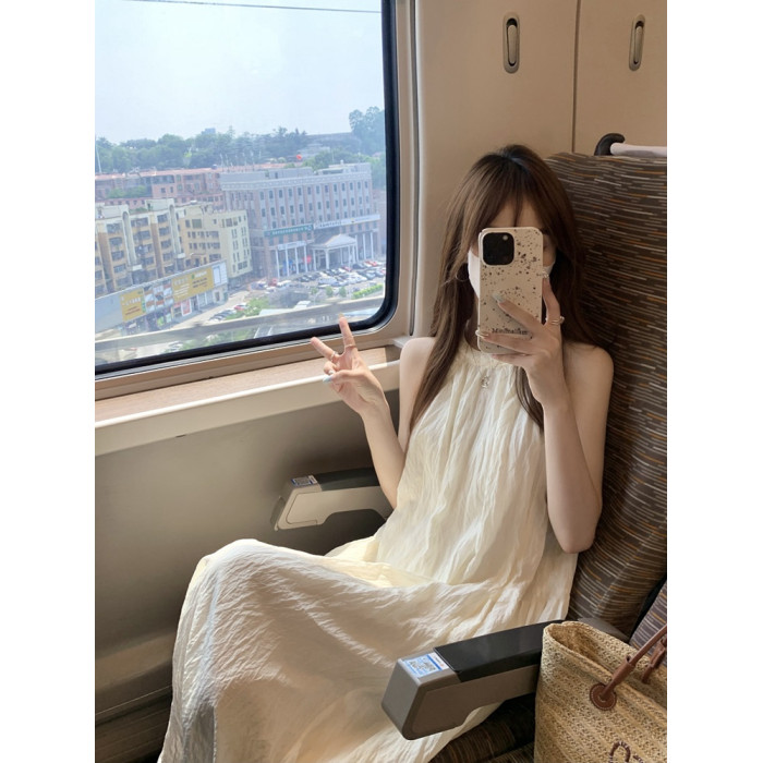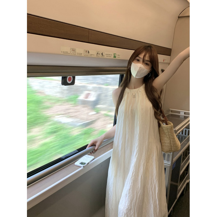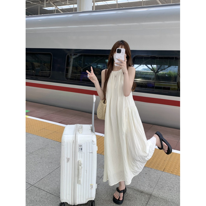 白色無袖背心連衣裙子女夏季2025新款海邊度假風掛脖吊帶沙灘長裙