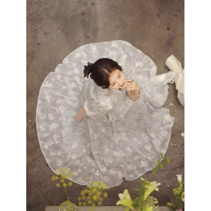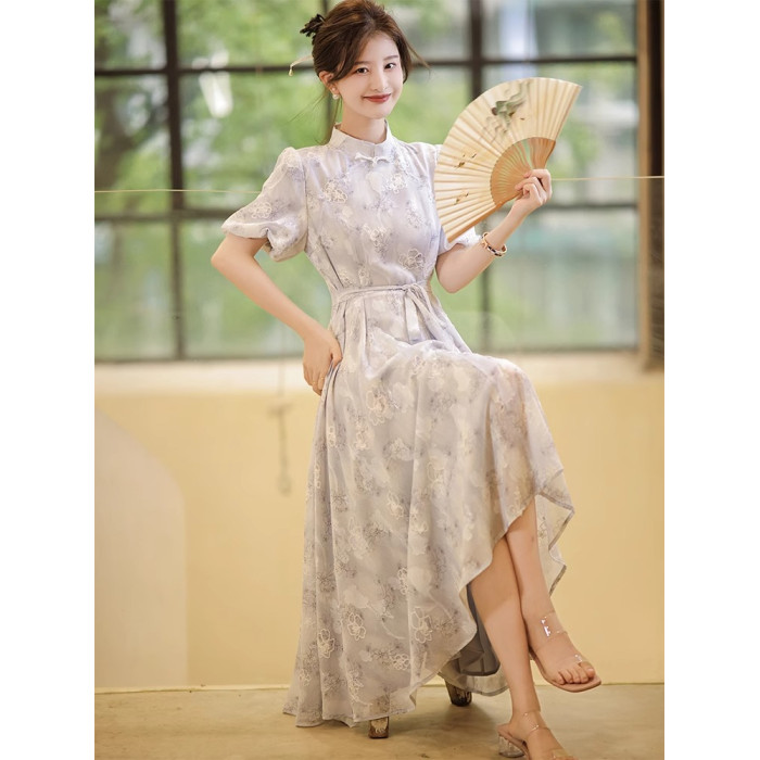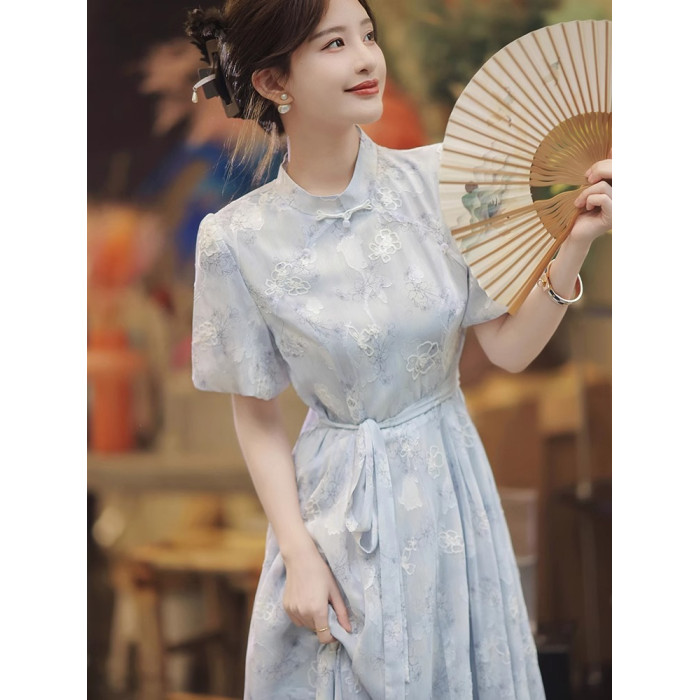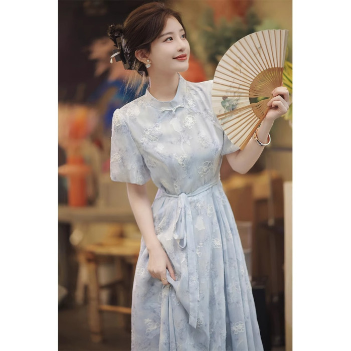 歐洲站2025新中式改良旗袍輕奢法式高級感氣質絕美藍色碎花連衣裙