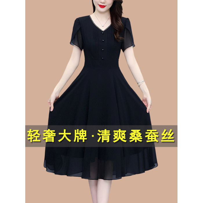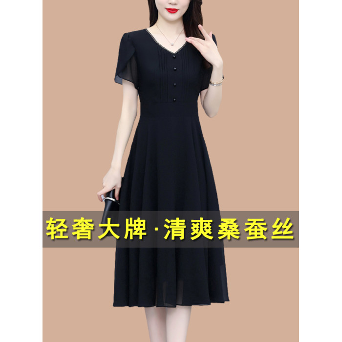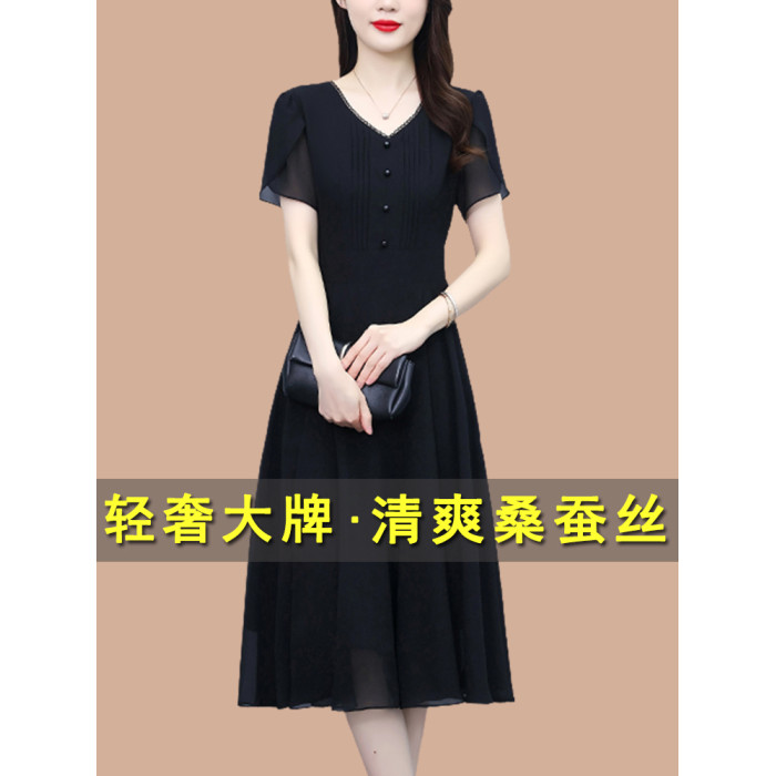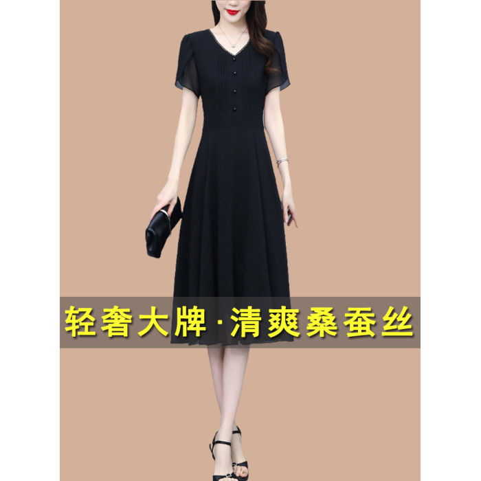 高級感桑蠶絲連衣裙女2025夏新款收腰顯瘦輕熟風黑色真絲a字裙子
