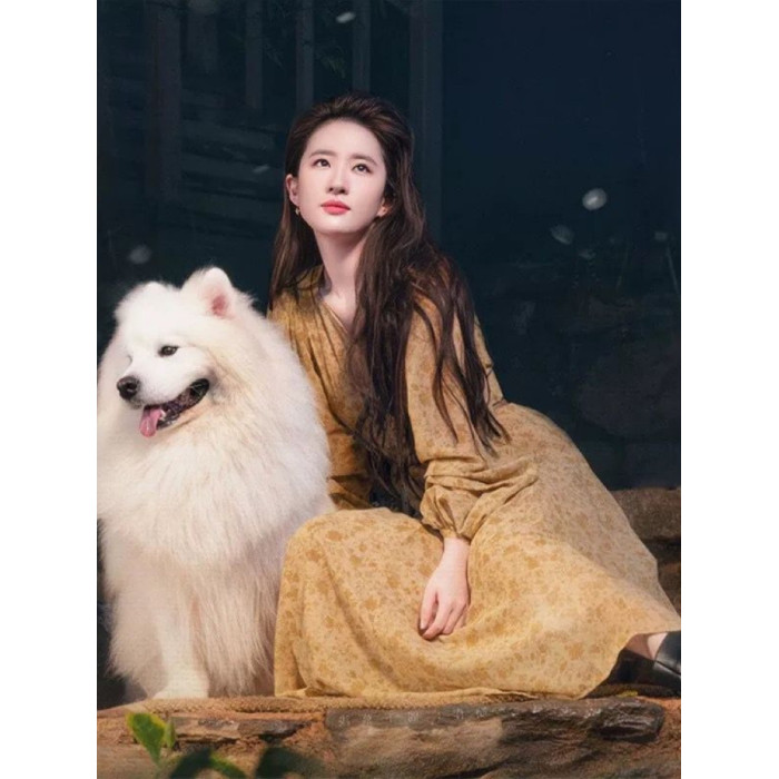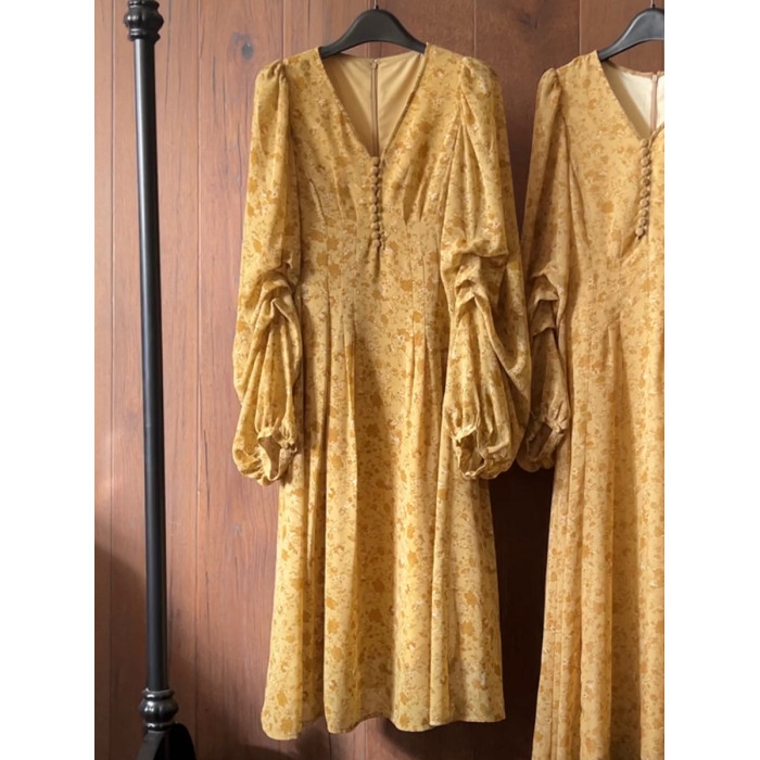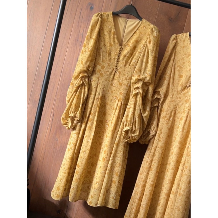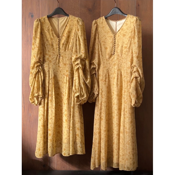 劉亦菲同款黃色V領泡泡袖中長款連衣裙海邊度假風法式碎花印花裙