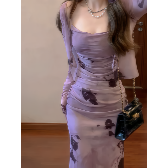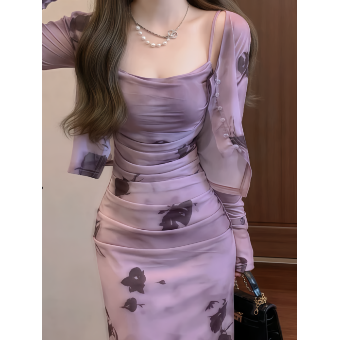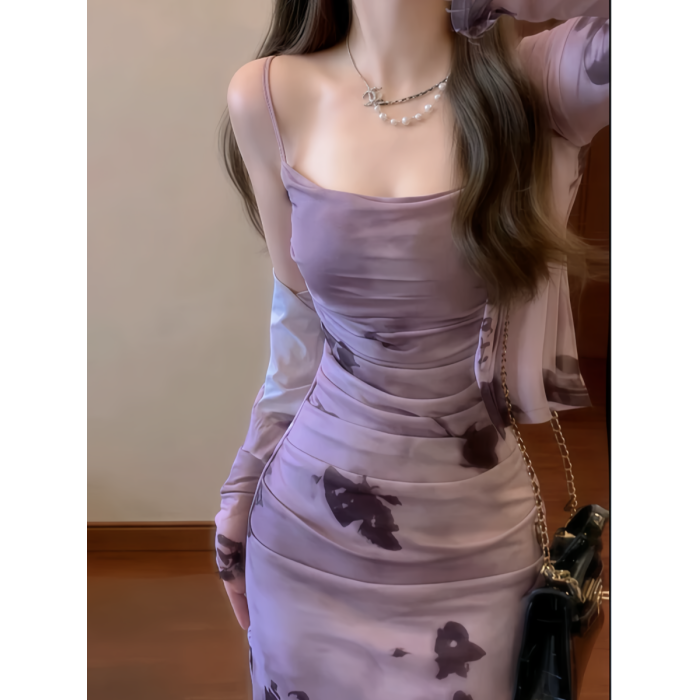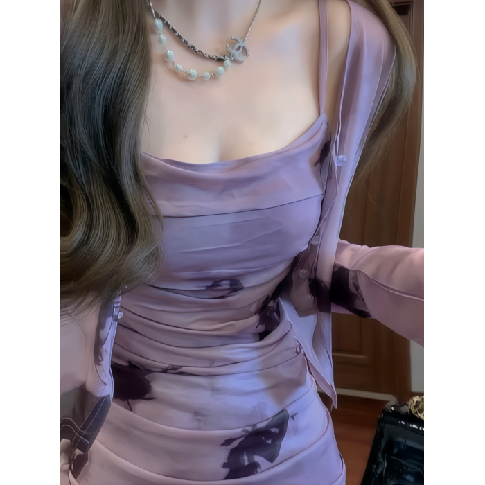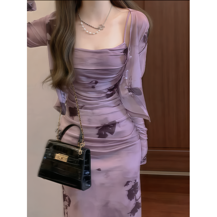 8802新中式一套夏季穿搭法式復古紫色吊帶裙兩件套防曬修身連衣裙