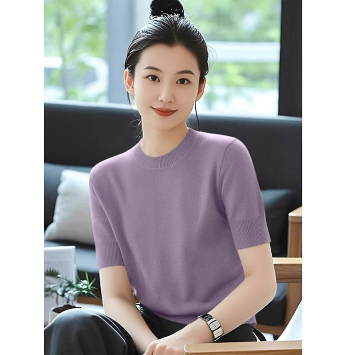 2025夏季新款圓領短袖針織衫女寬松顯瘦百搭上衣薄款毛衣打底衫女