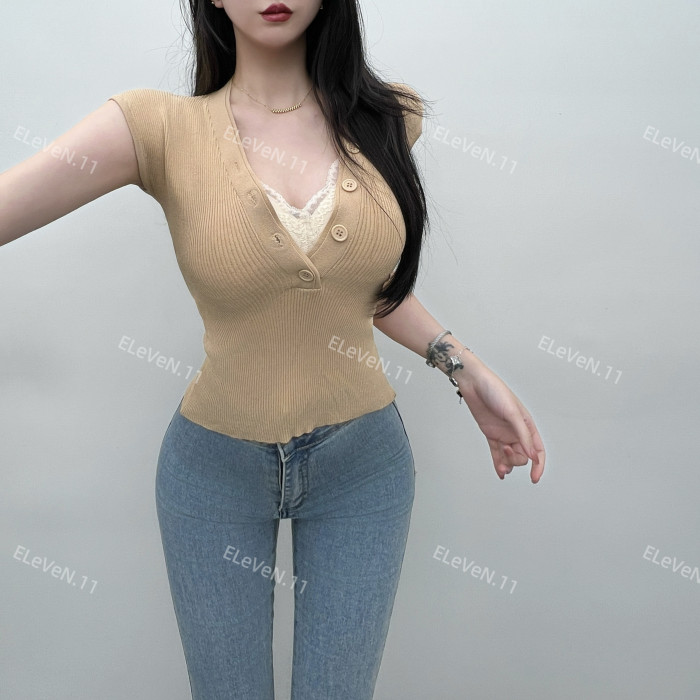 薄款冰絲v領飛飛袖針織衫女夏外穿內搭緊身韓版短款打底衫上衣