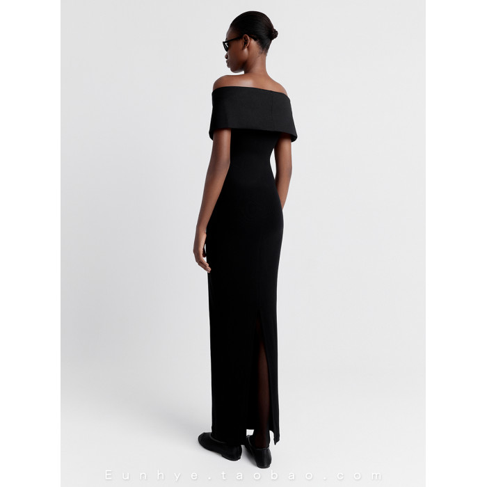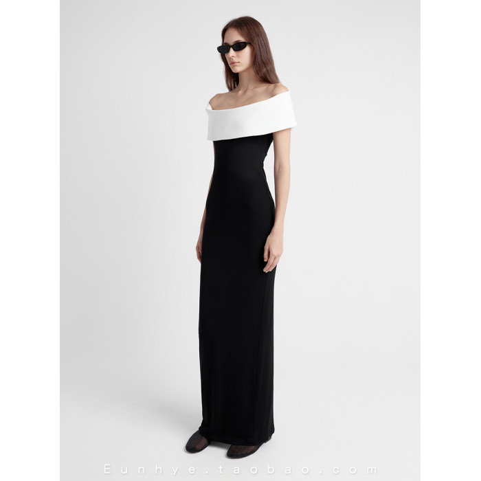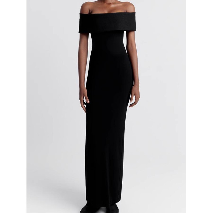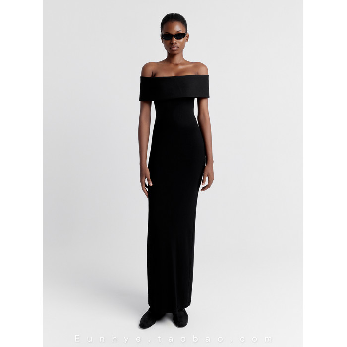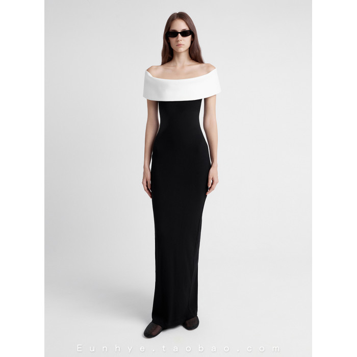 越南小衆2025年夏季新款酷颯大女主弧形一字肩曲線長裙修身連衣裙