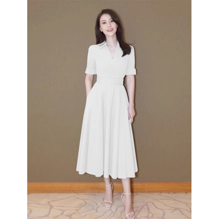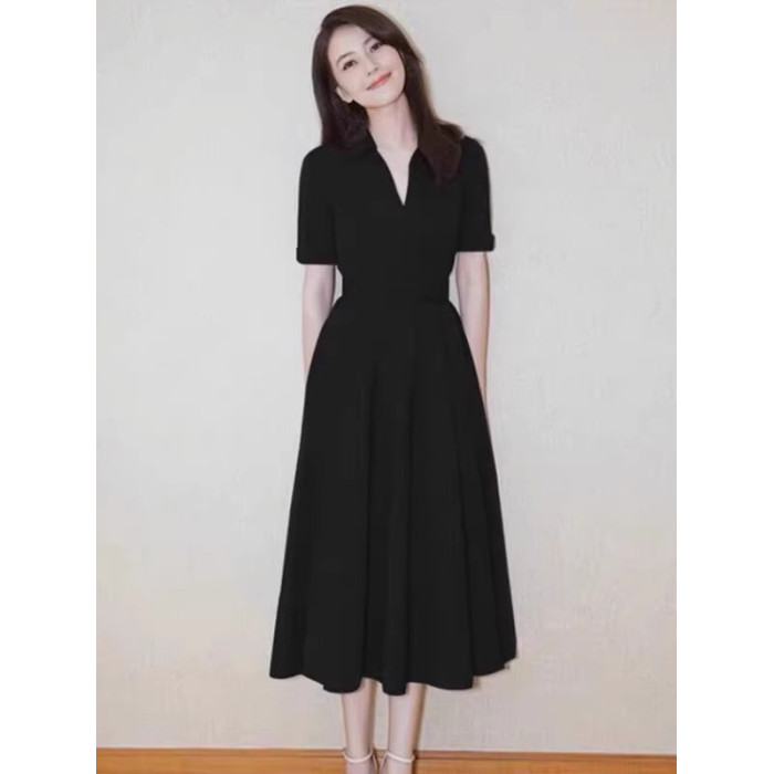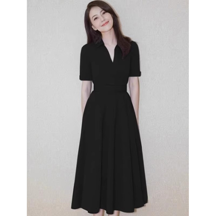 XZOXZO 法式赫本風黑色v領連衣裙2025新款女夏季氣質收腰顯瘦長裙
