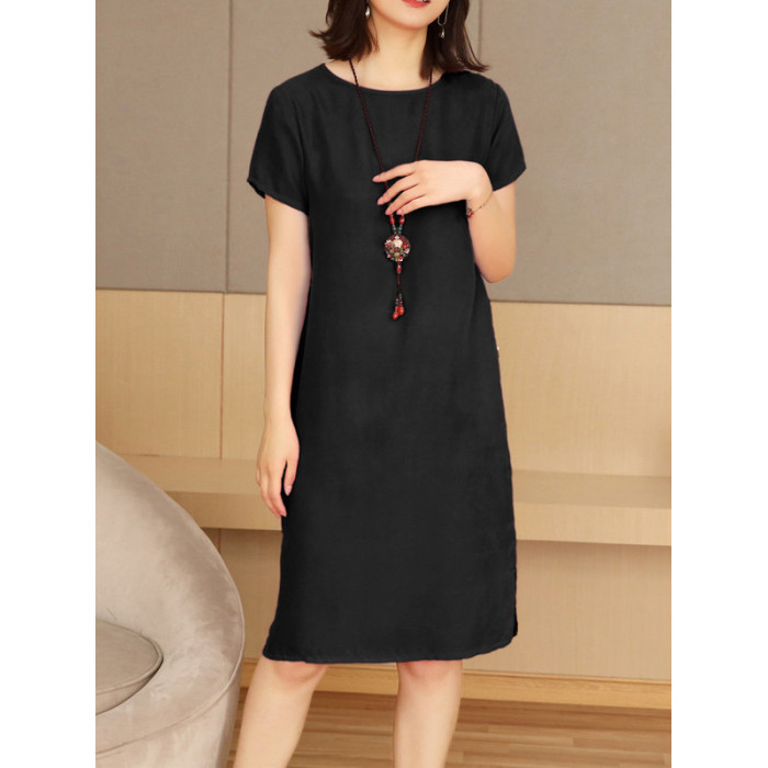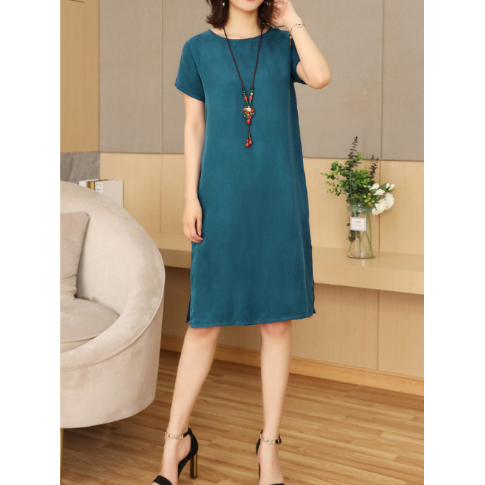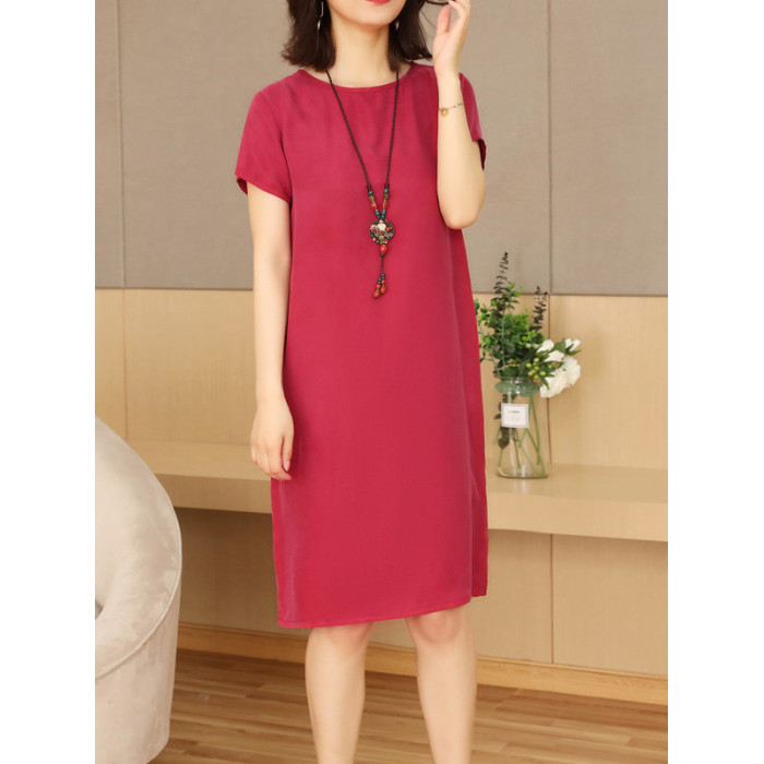 2025夏新款重磅真銅氨絲連衣裙女短袖寬松透氣媽媽裝休閒中長裙子