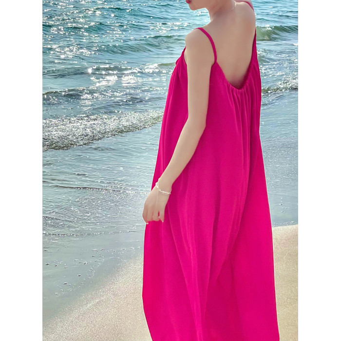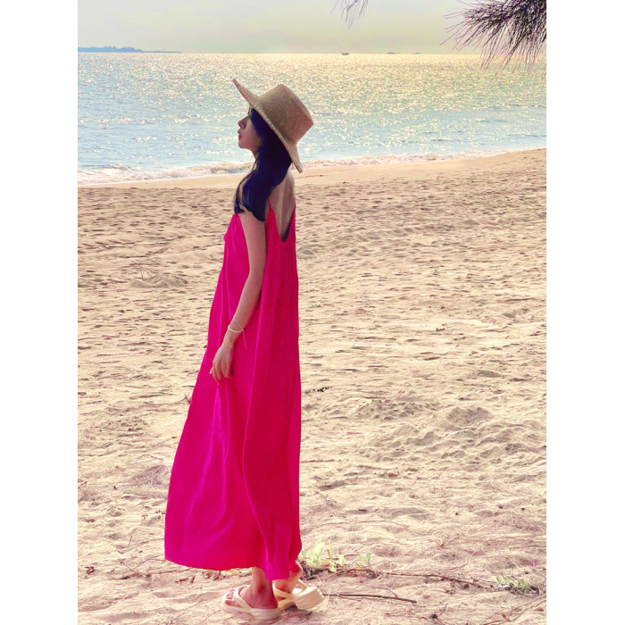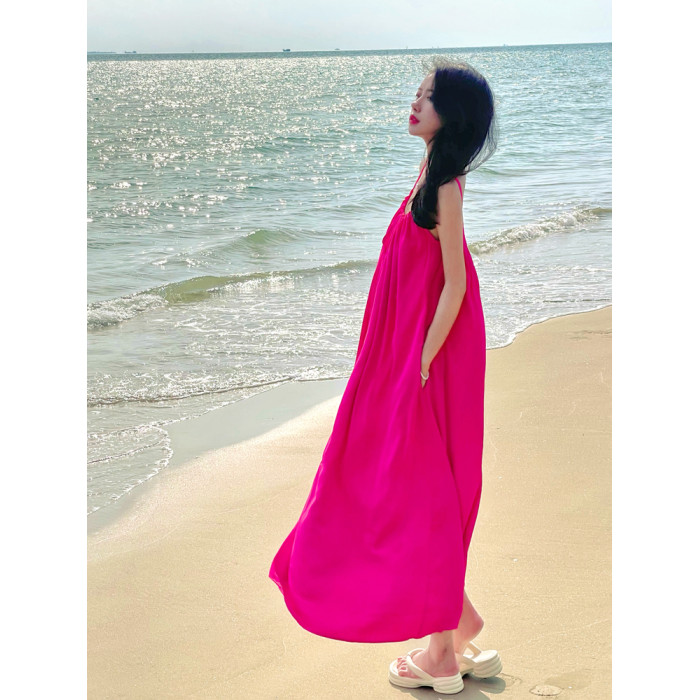 海南拍照露背沙灘裙女夏海邊度假連衣裙火龍果色雪紡大碼吊帶裙子