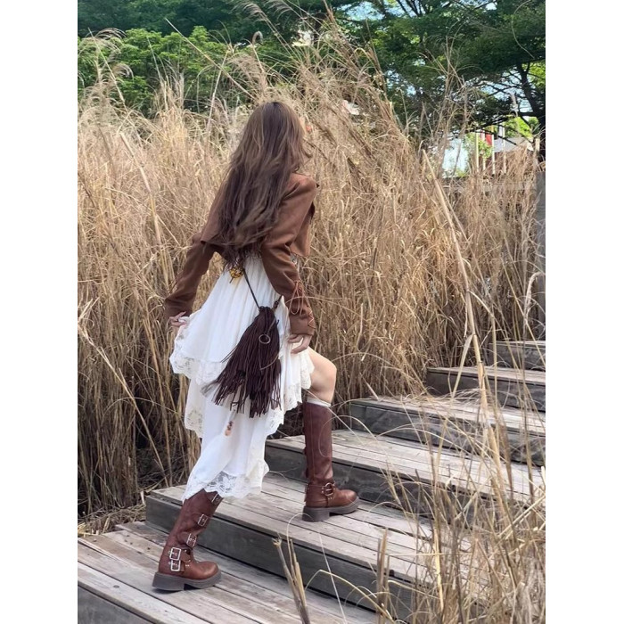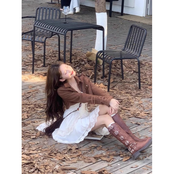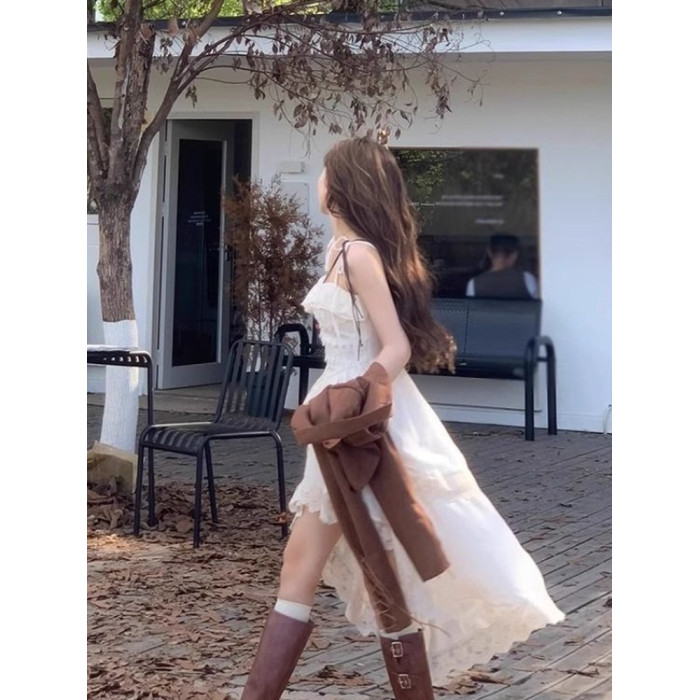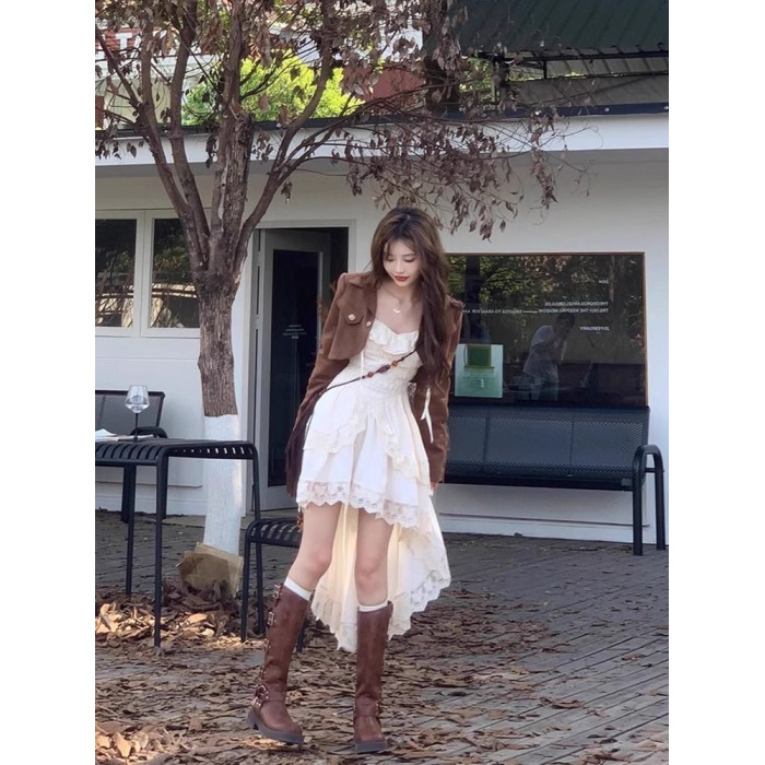 雲南新疆川西旅遊穿搭拍照不規則吊帶連衣裙女復古短款外套套裝女