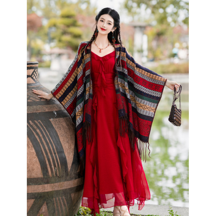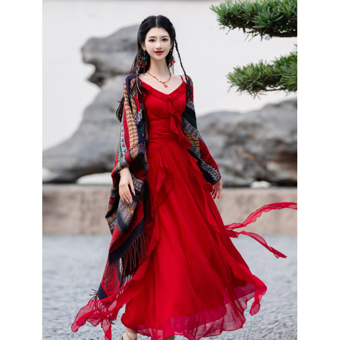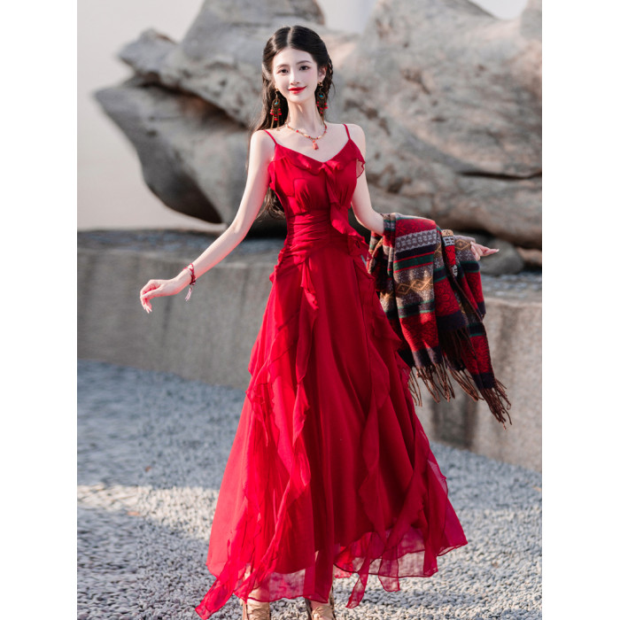 夏日絕美小裙子復古民族風紅色雪紡吊帶連衣裙海邊度假沙灘長裙仙