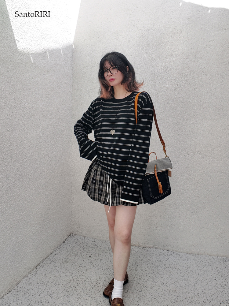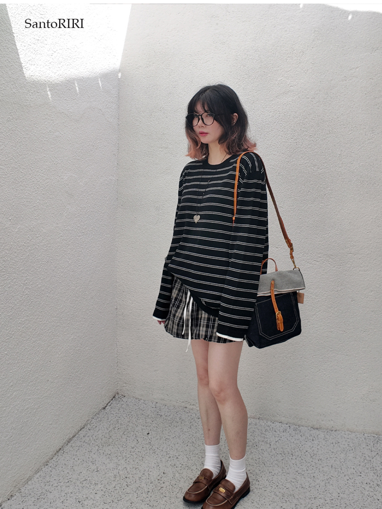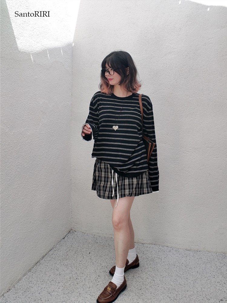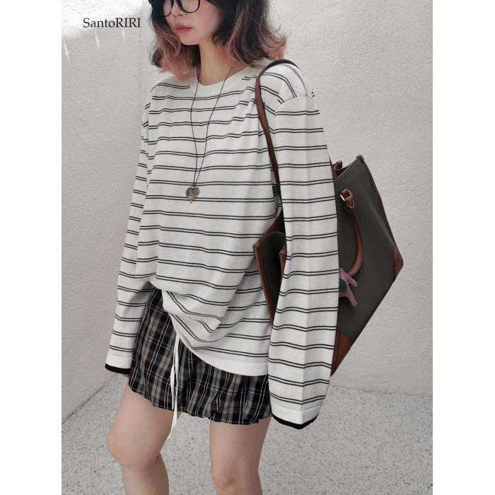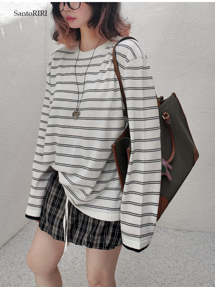 肯豆風 松弛感袖口撞色綿羊毛混紡條紋針織打底衫冬季百搭上衣女