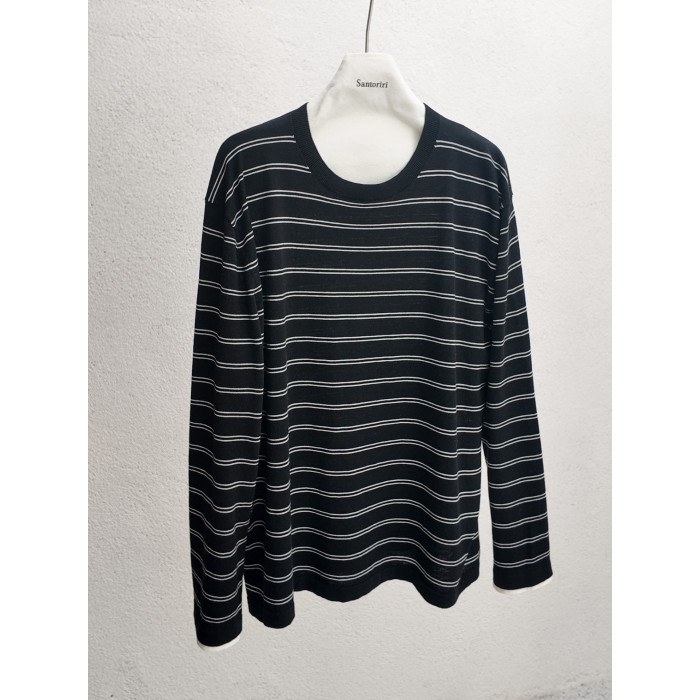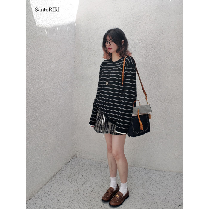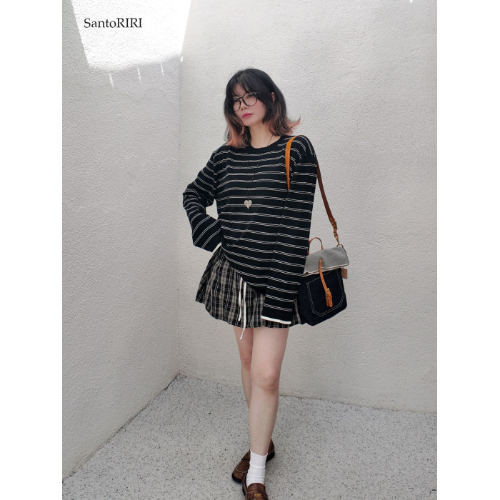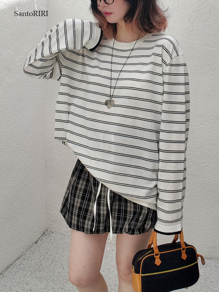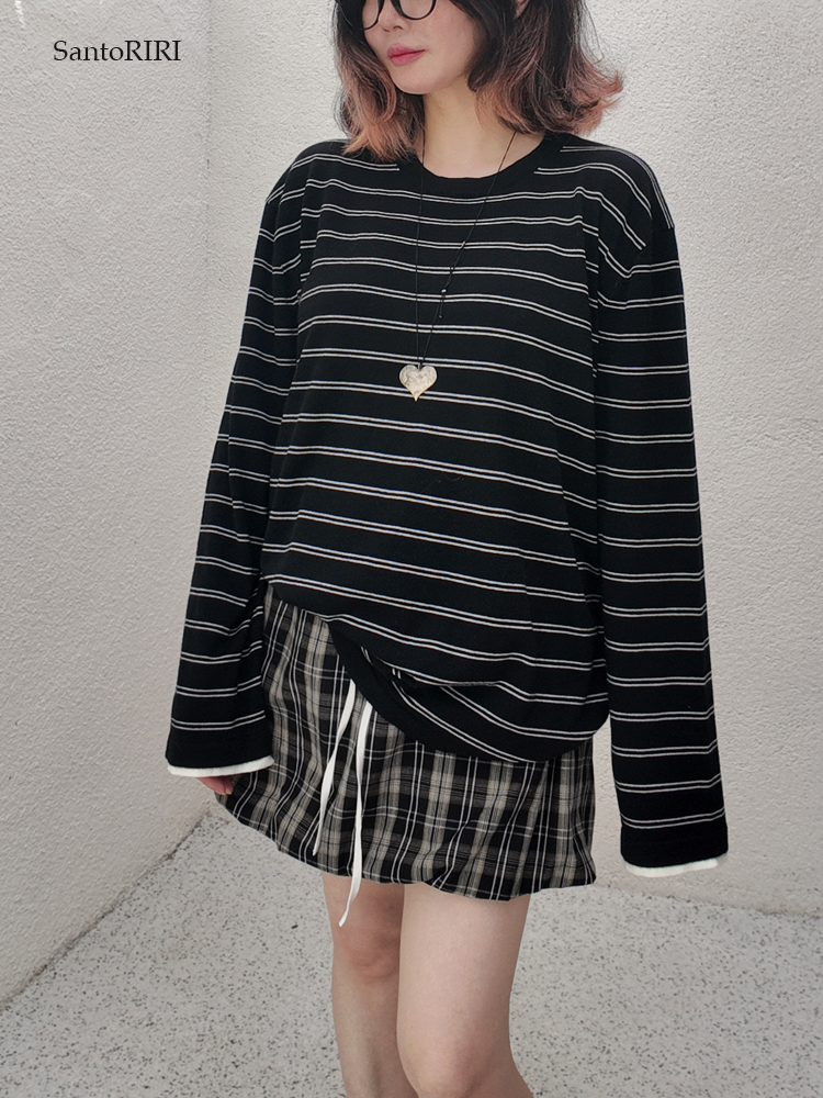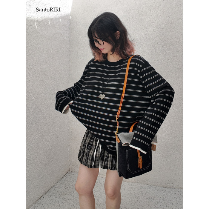肯豆風 松弛感袖口撞色綿羊毛混紡條紋針織打底衫冬季百搭上衣女