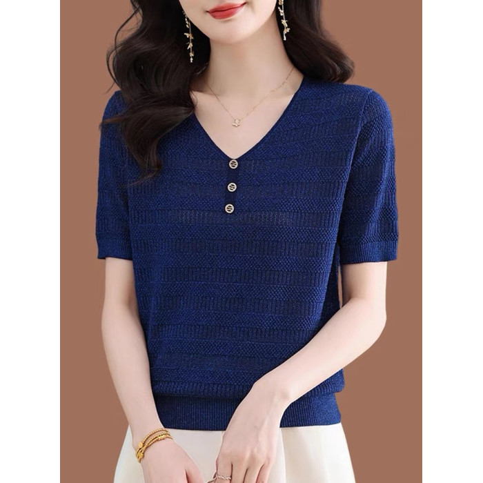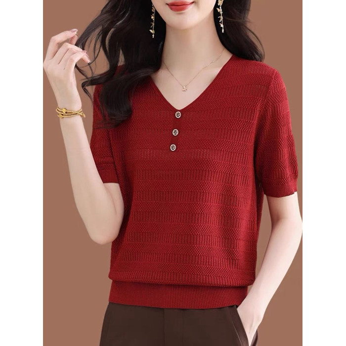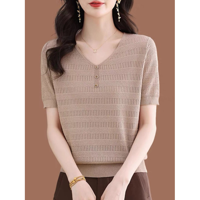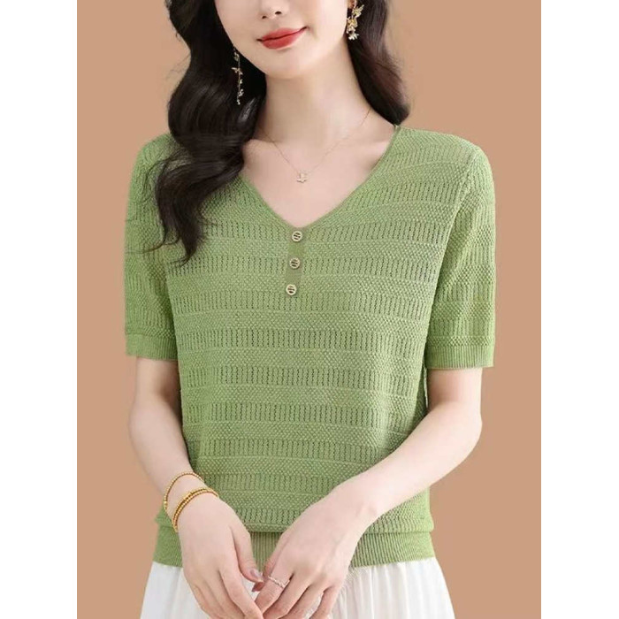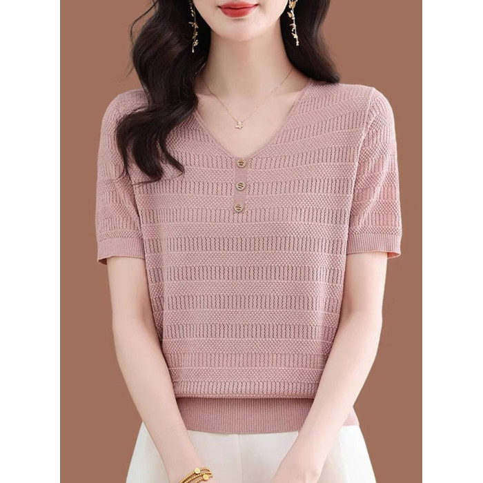 夏裝薄款內搭V領純色棉線鏤空短袖針織衫女韓版寬松顯瘦打底衫薄
