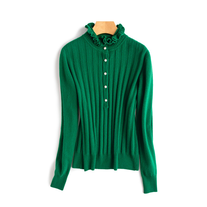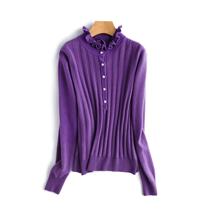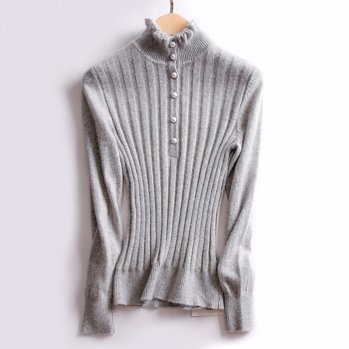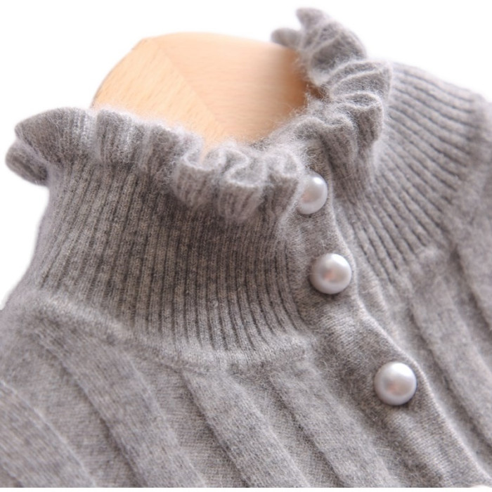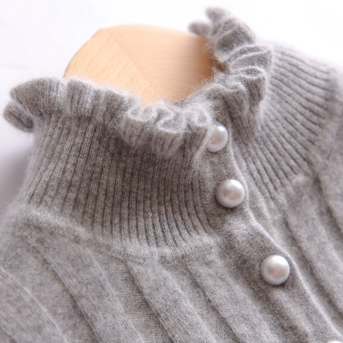 秋冬新款山羊絨衫女 淺灰色花邊領打底衫套頭針織衫 高領羊絨毛衣