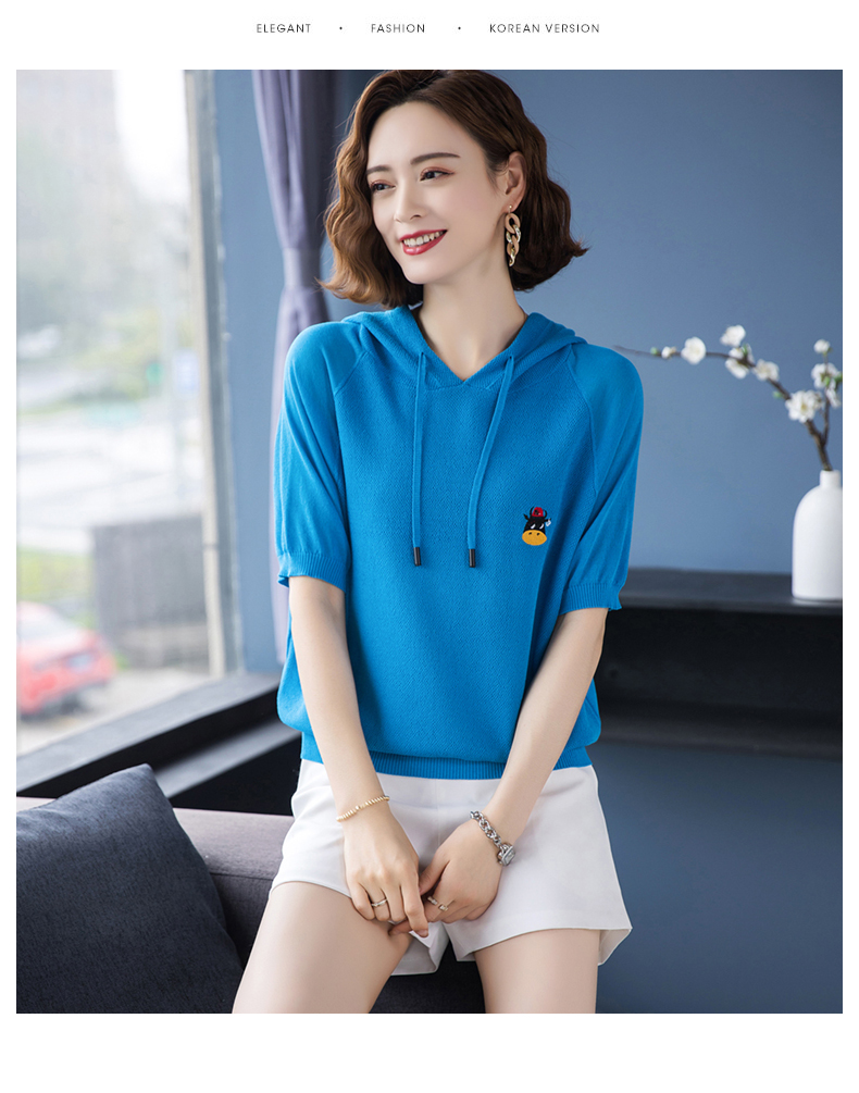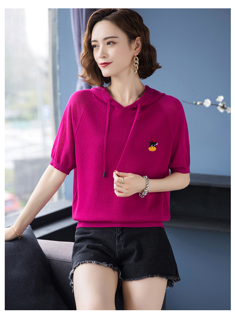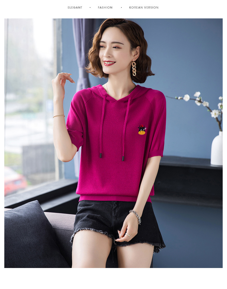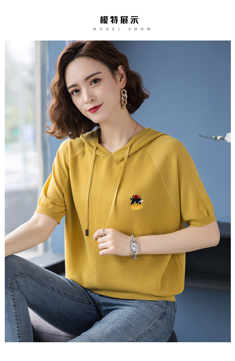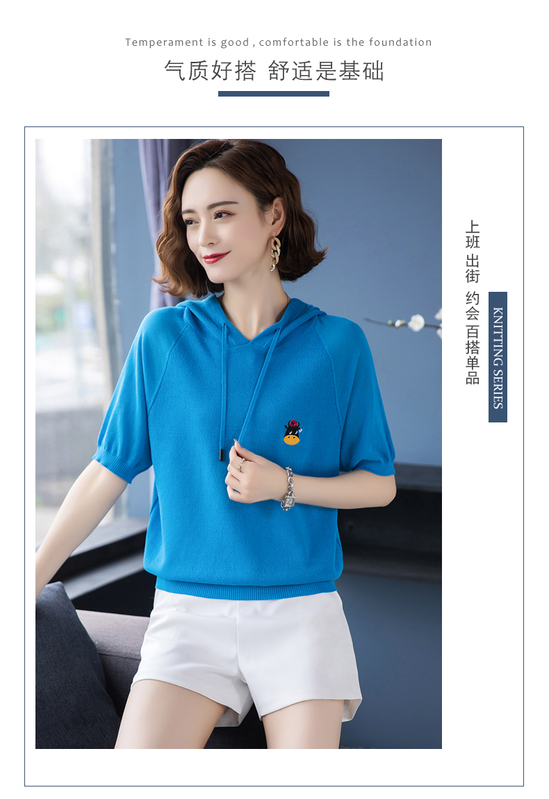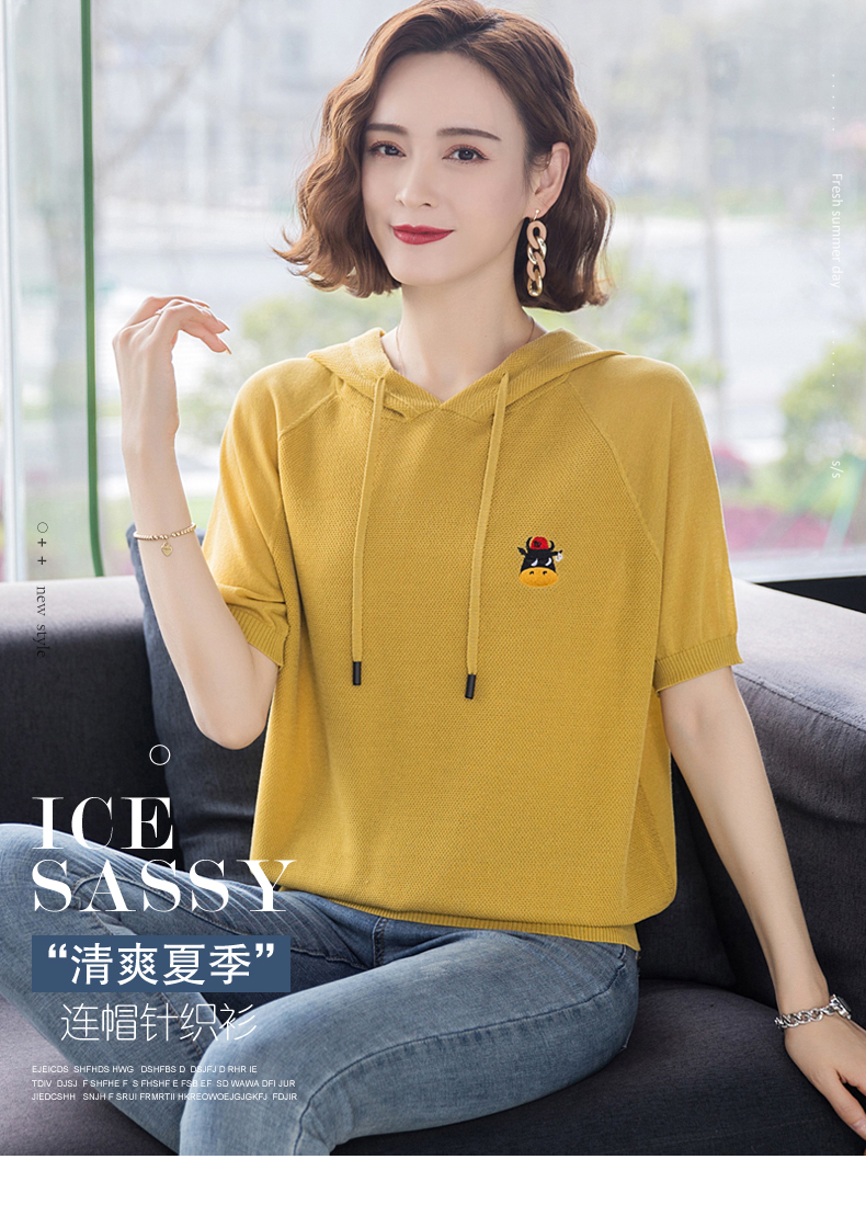 中年媽媽夏短袖女裝針織衫短款寬松冰絲上衣連帽衛衣薄款打底衫潮