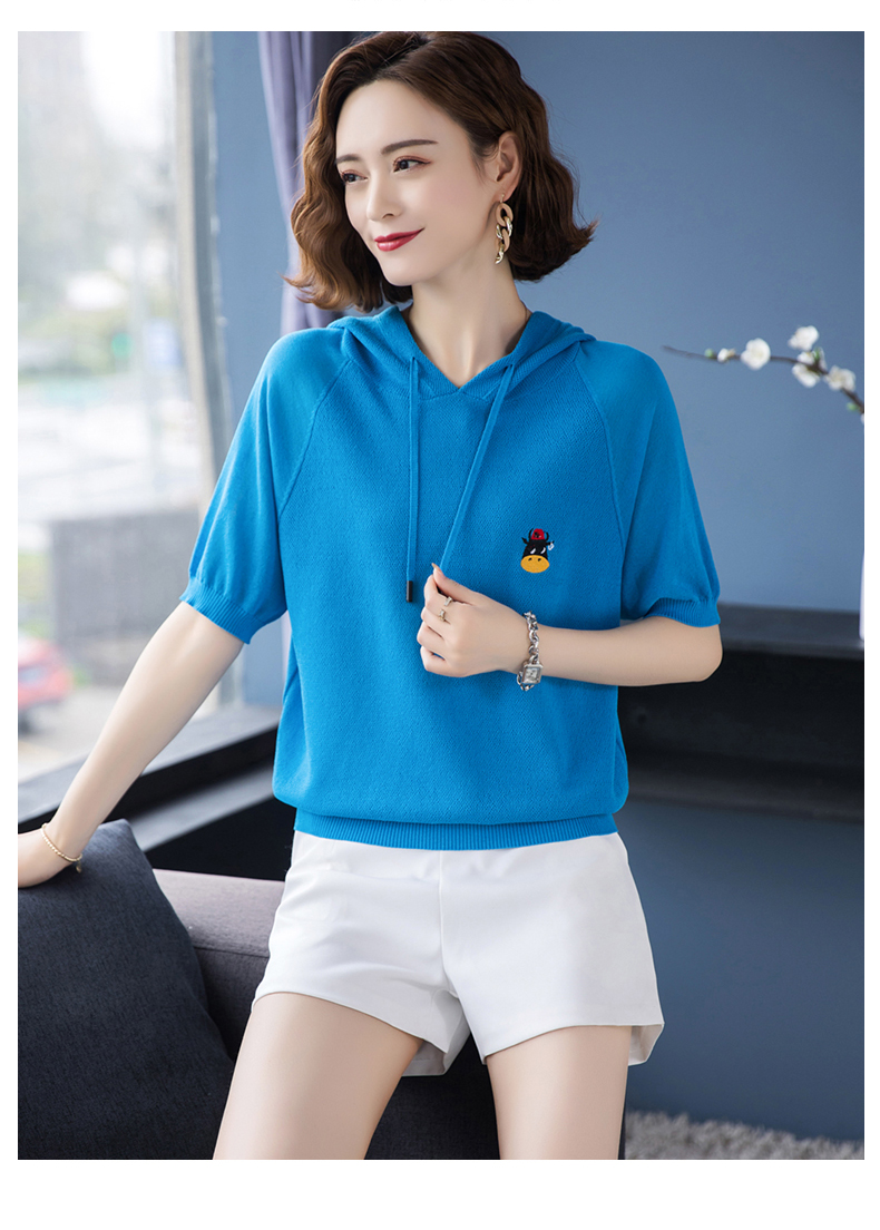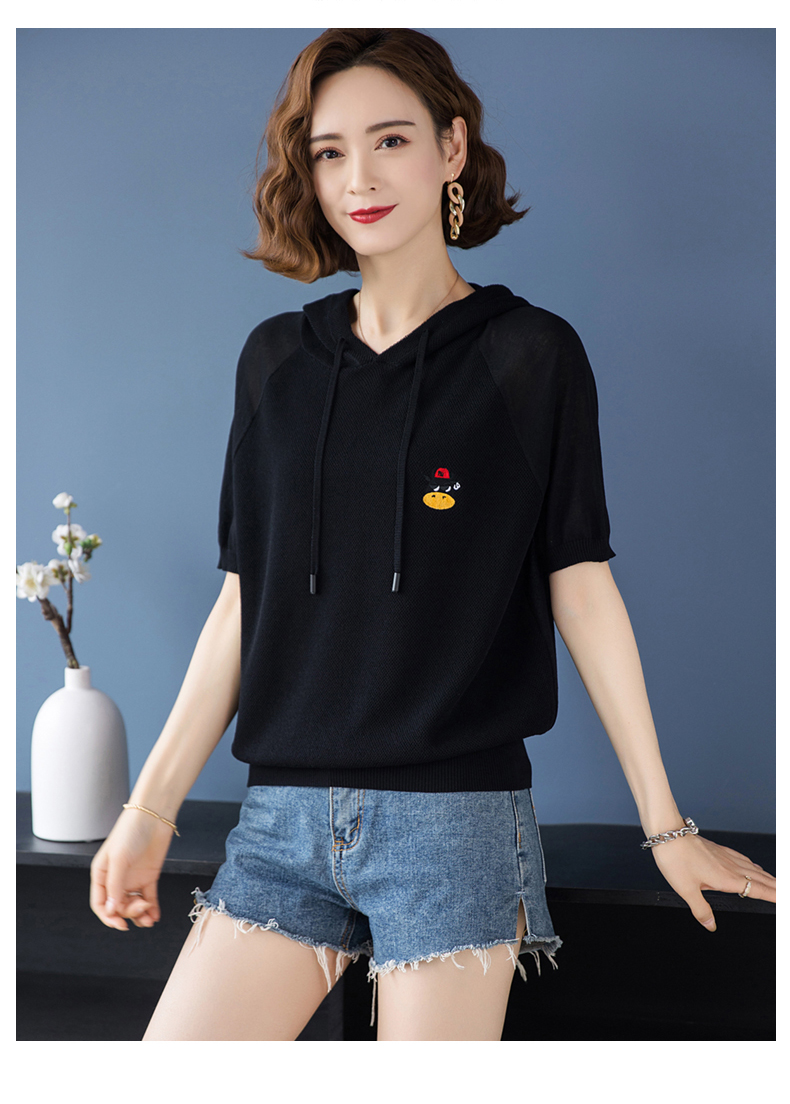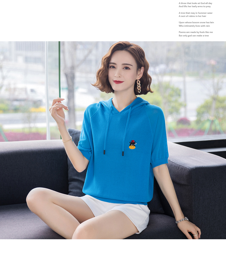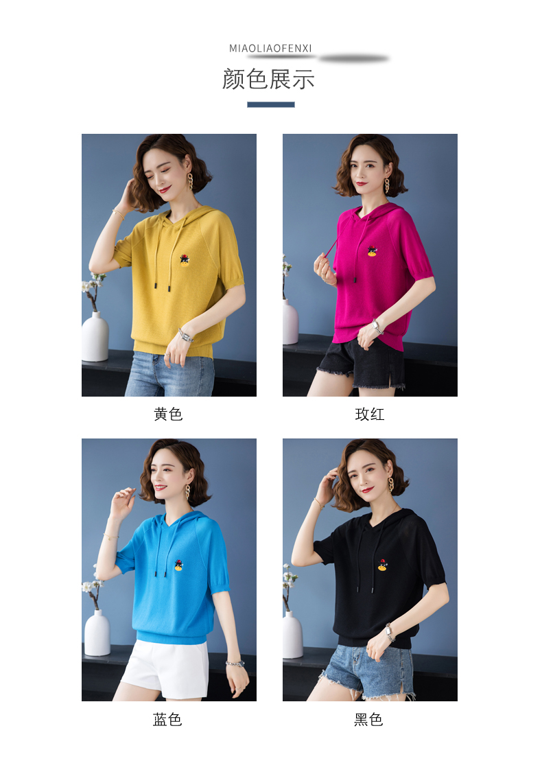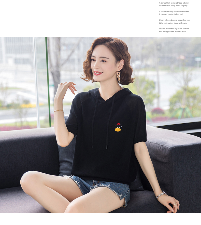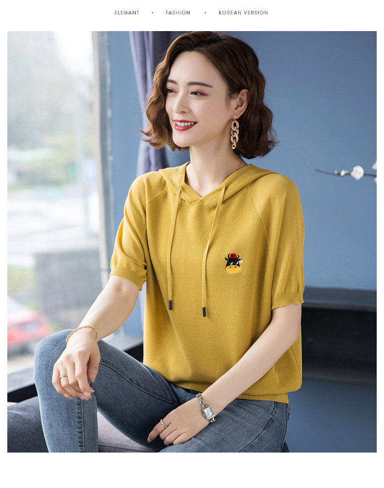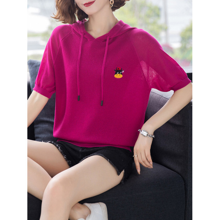 中年媽媽夏短袖女裝針織衫短款寬松冰絲上衣連帽衛衣薄款打底衫潮