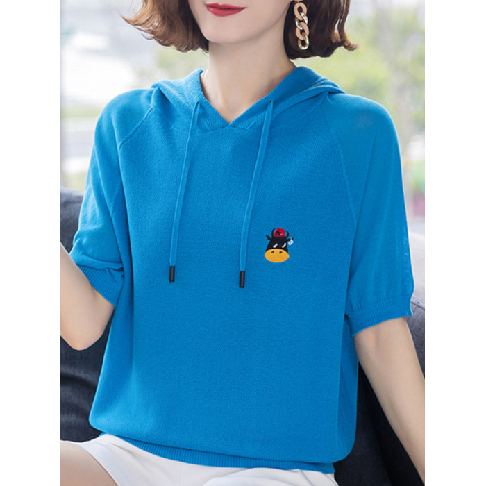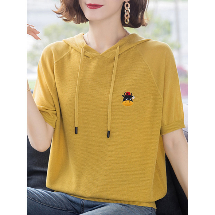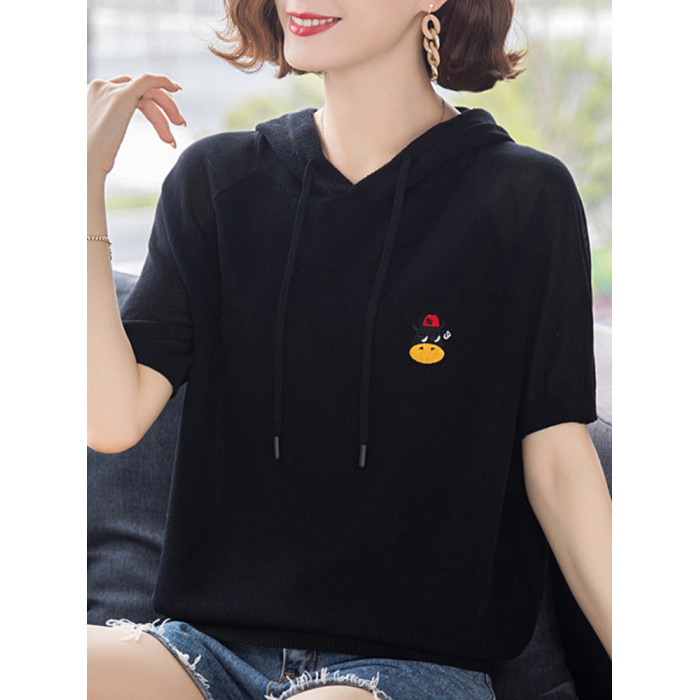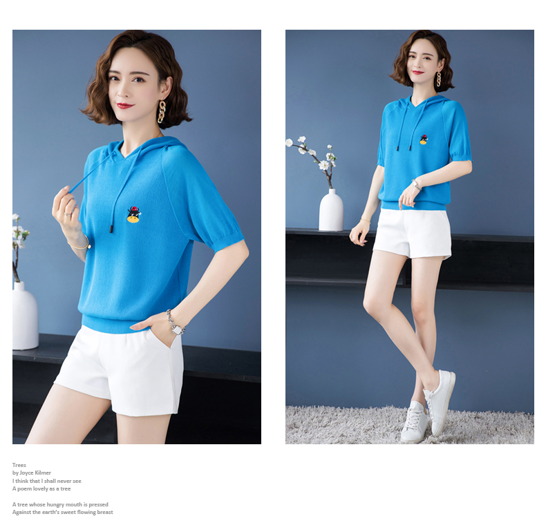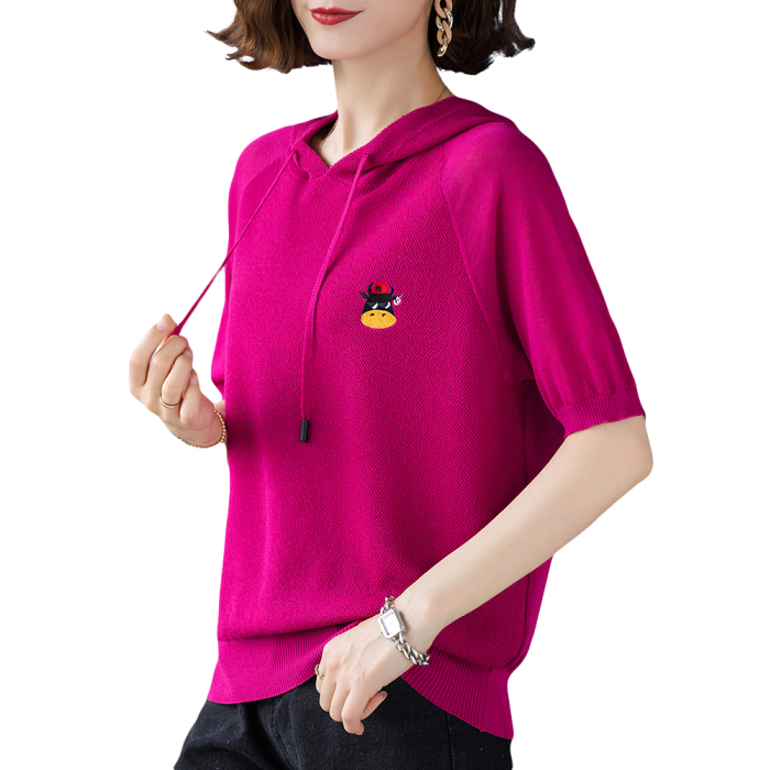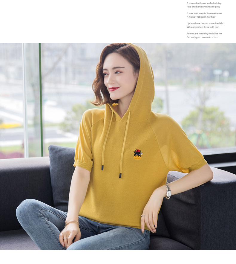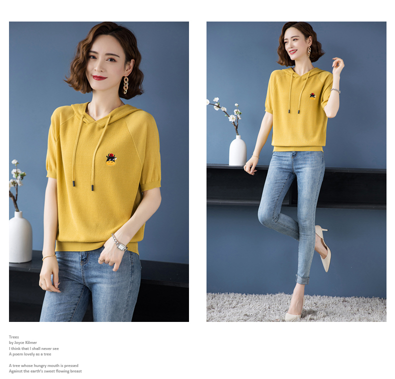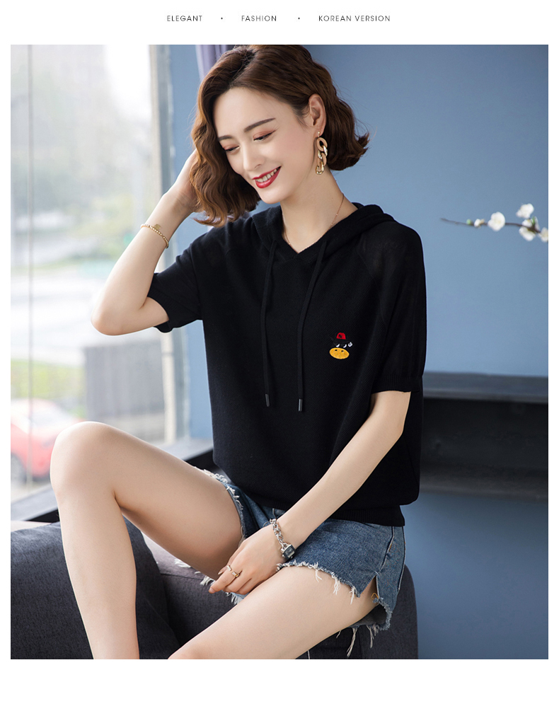 中年媽媽夏短袖女裝針織衫短款寬松冰絲上衣連帽衛衣薄款打底衫潮
