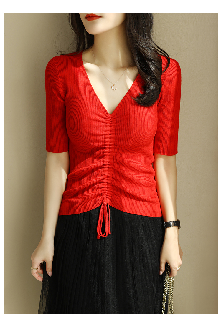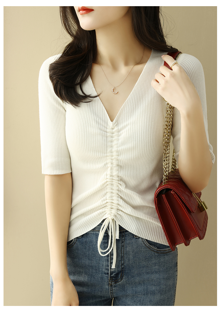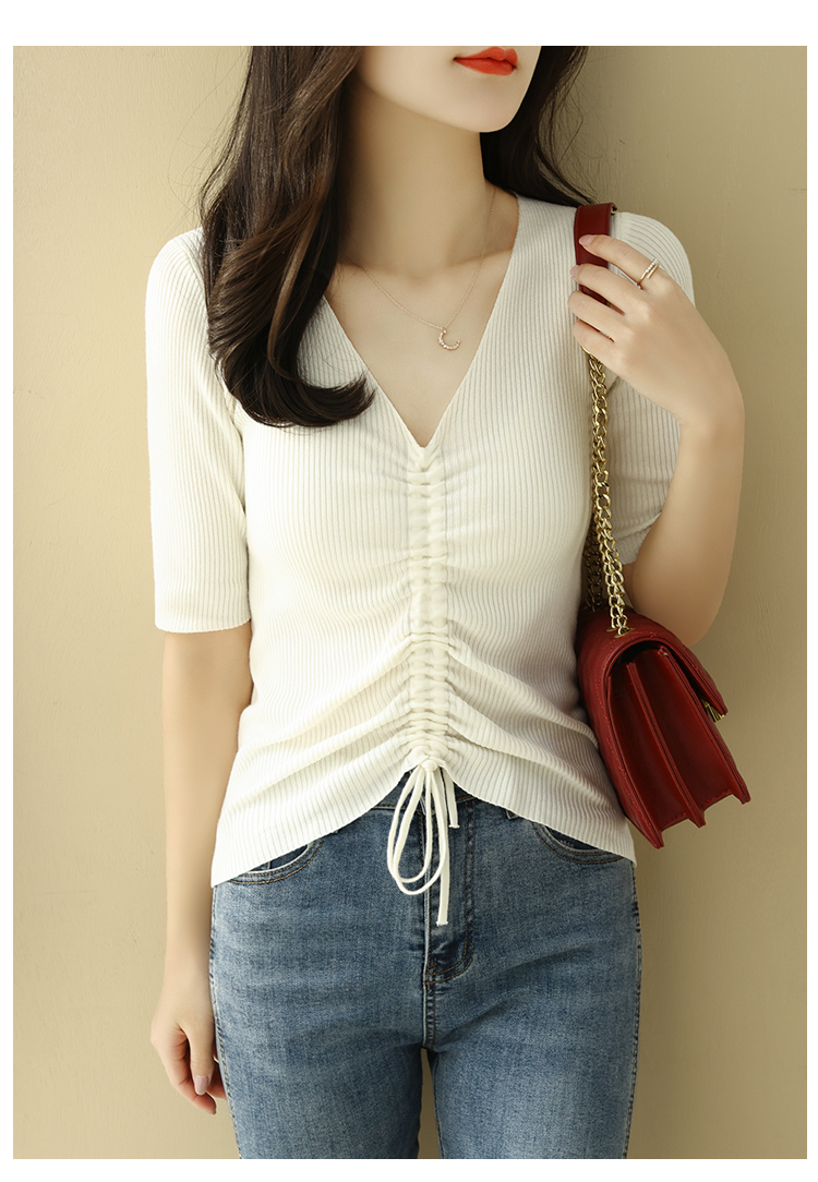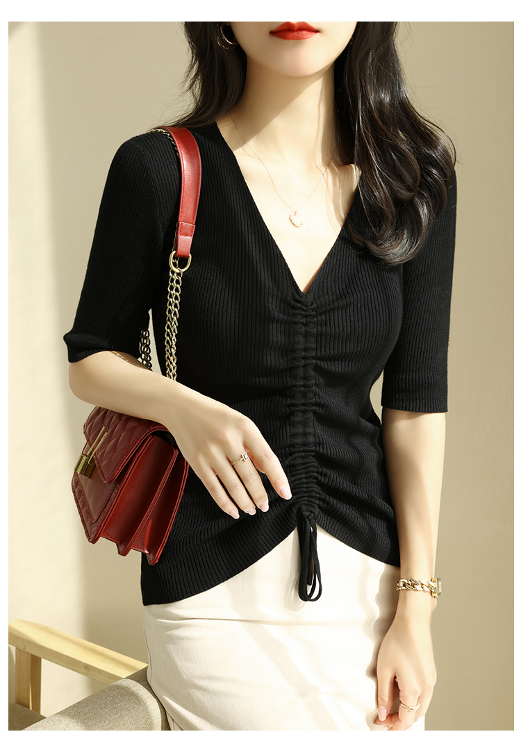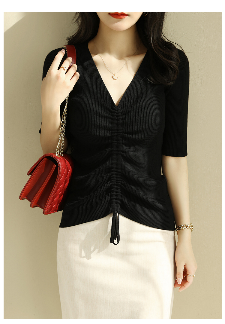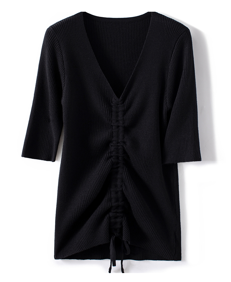 新款2024春秋v領抽繩系帶五分袖針織打底衫女修身黑色中袖上衣薄