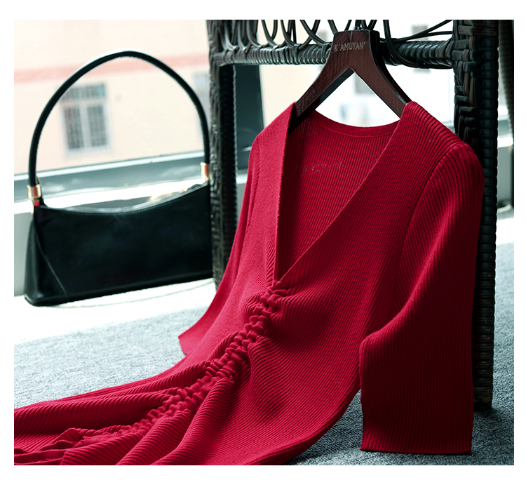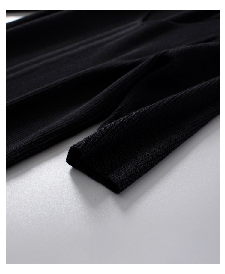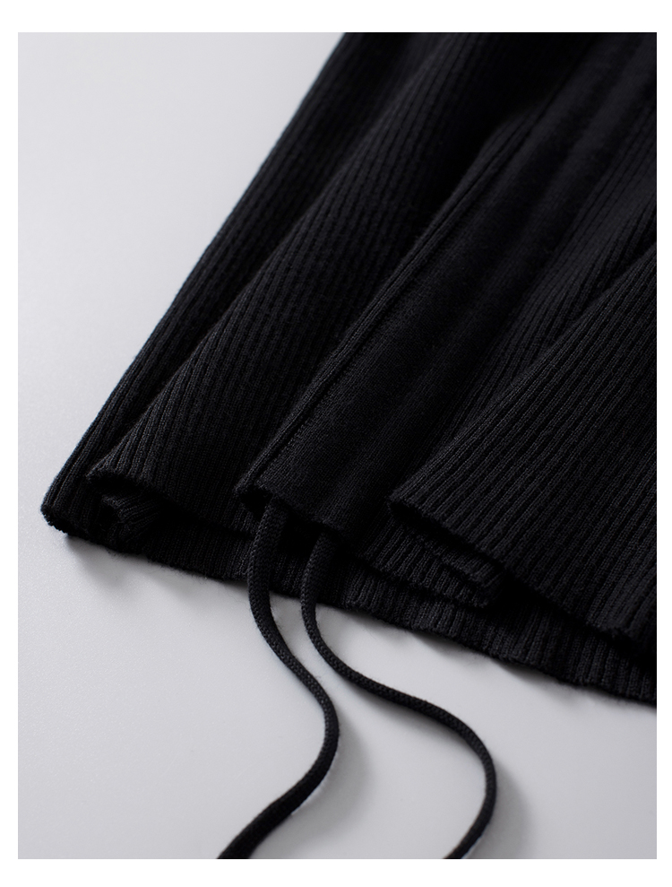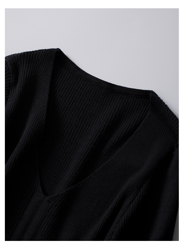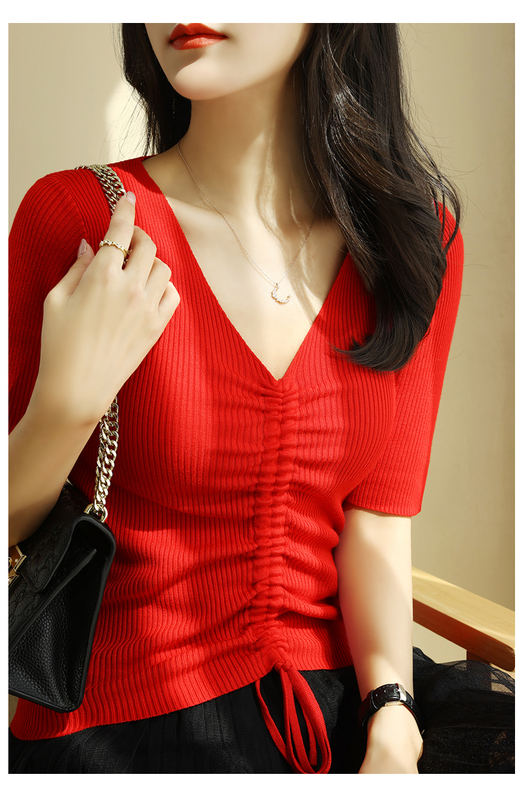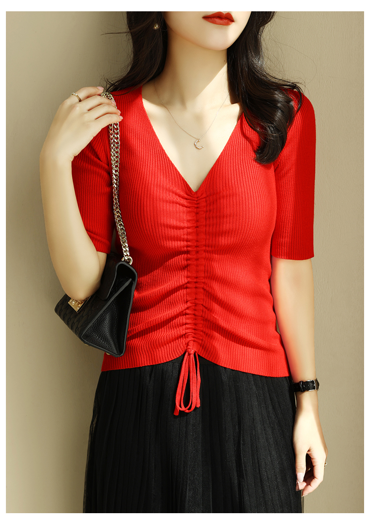 新款2024春秋v領抽繩系帶五分袖針織打底衫女修身黑色中袖上衣薄